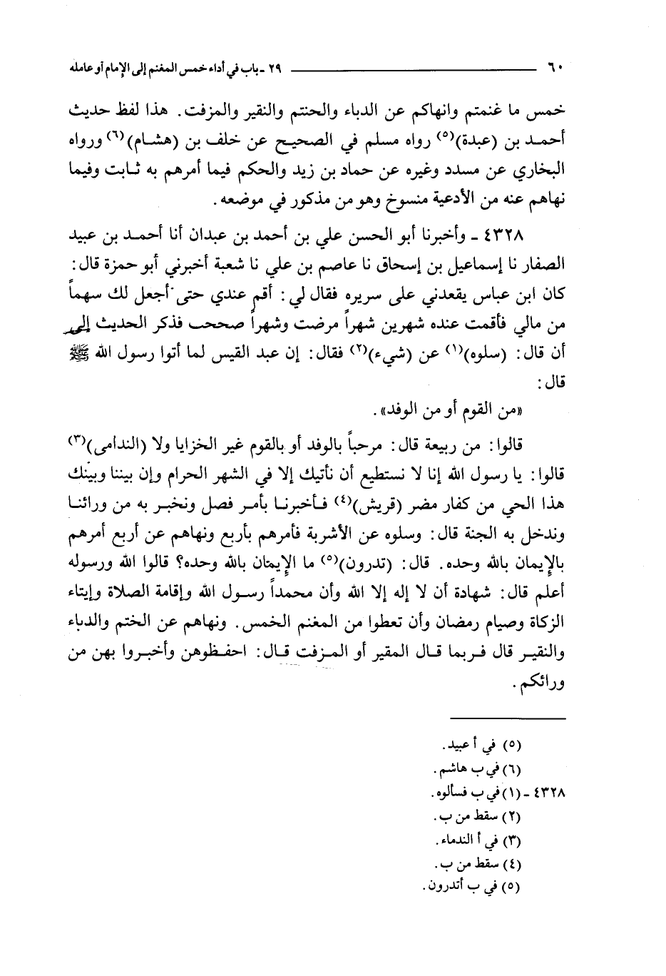 4328 - و أخبرنا أبو الحسن علي بن أحمد بن عبدان أنا أحمد بن عبيد الصفار نا إسماعيل بن إسحاق نا عاصم بن علي نا شعبة أخبرني أبو حمزة قال : كان ابن عباس يقعدني على سريره فقال لي : أقم عندي حتى أجعل لك سهما من مالي فأقمت عنده شهرين شهرا مرضت و شهرا صححت فذكر الحديث إلى أن قال : سلوه عن شيء فقال : إن عبد القيس لما أتوا رسول الله صلى الله عليه و سلم قال :