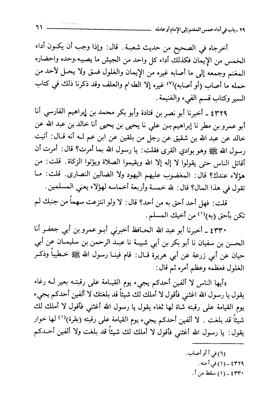 أيها الناس لا ألفين أحدكم يجيء يوم القيامة على رقبته بعير له رغاء يقول يا رسول الله اغثني فأقول لا أملك لك شيئا قد بلغتك لا ألفين أحدكم يجيء يوم القيامة على رقبته شاة لها ثغاء يقول يا رسول الله أغثني فأقول لا أملك لك شيئا قد بلغت لا ألفين أحدكم يجيء يوم القيامة على رقبته بقرة لها خوار يقول : يا رسول الله أغثني فأقول لا أملك لك شيئا قد بلغت و لا ألفين أحدكم يجيء يوم القيامة على رقبته رقاع يقول : يا رسول الله أغثني فأقول : لا أملك لك من الله شيئا قد بلغتك
