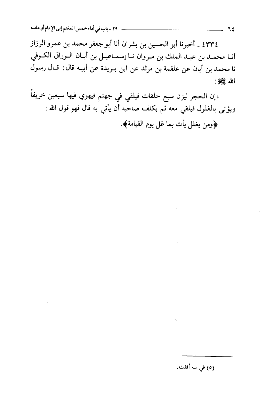 4334 - أخبرنا أبو الحسن بن بشران أنا أبو جعفر محمد بن عمرو الرزاز أنا محمد بن عبد الملك بن مروان نا إسماعيل بن أبان الوراق الكوفي نا محمد بن أبان عن علقمة بن مرئد عن ابن بريدة عن أبيه قال : قال رسول الله صلى الله عليه و سلم : إن الحجر ليزن سبع حلقات فيلقى في جهنم فيهوي فيها سبعين خريفا و يؤتي بالغلول فيلقي معه ثم يكلف صاحبه أن يأتي به قال فهو قول الله :