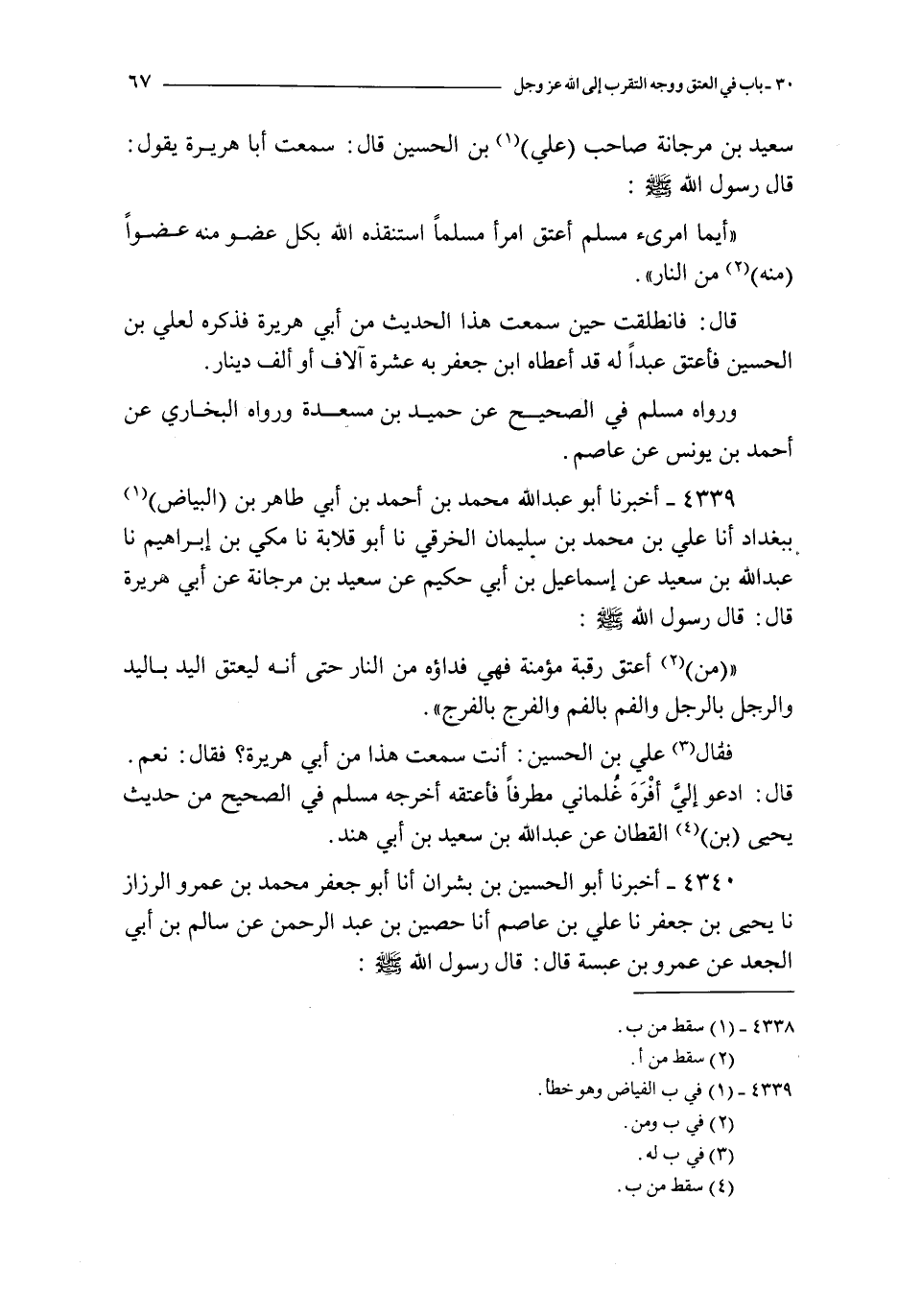 فقال علي بن الحسين : أنت سمعت هذا من أبي هريرة ؟ فقال : نعم قال : ادعو إلي أفره غلماني مطرفا فأعتقه مسلم في الصحيح من حديث يحيى بن القطان عن عبد الله بن سعيد بن أبي هند