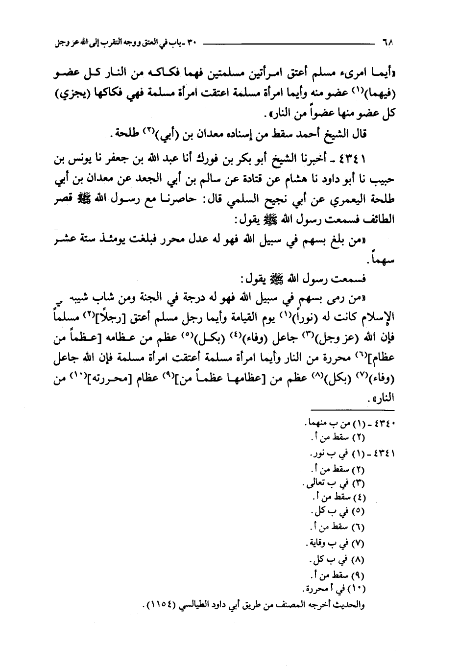 من رمى بسهم في سبيل الله فهو له درجة في الجنة و من شاب شيبة في الإسلام كانت له نورا يوم القيامة و أيما رجل مسلم أعتق رجلا مسلما فإن الله عز و جل جاعل وفاء بكل عظم من عظامه عظما من عظام محررة من النار و أيما امرأة مسلمة أعتقت امرأة مسلمة فإن الله جاعل وفاء بكل عظم من عظامها عظما من عظام محررته من النار
