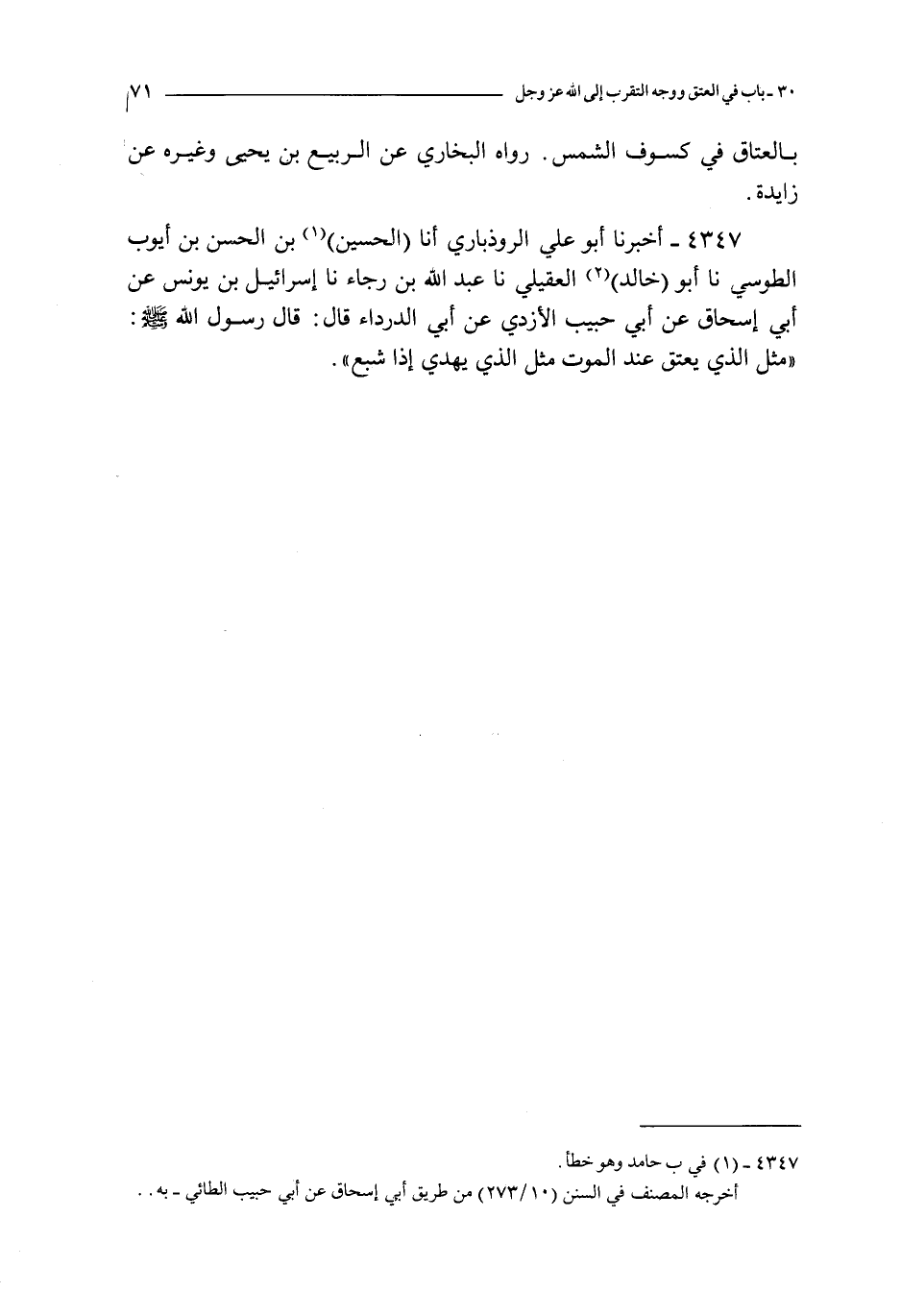 4347 - أخبرنا أبو علي الروذباري أنا الحسين بن الحسن بن أيوب الطوسي نا أبو خالد العقيلي نا عبد الله بن رجاء نا إسرائيل بن يونس عن أبي إسحاق عن أبي حبيب الأزدي عن أبي الدرداء قال : قال رسول الله صلى الله عليه و سلم : مثل الذي يعتق عند الموت مثل الذي يهدي إذا شبع