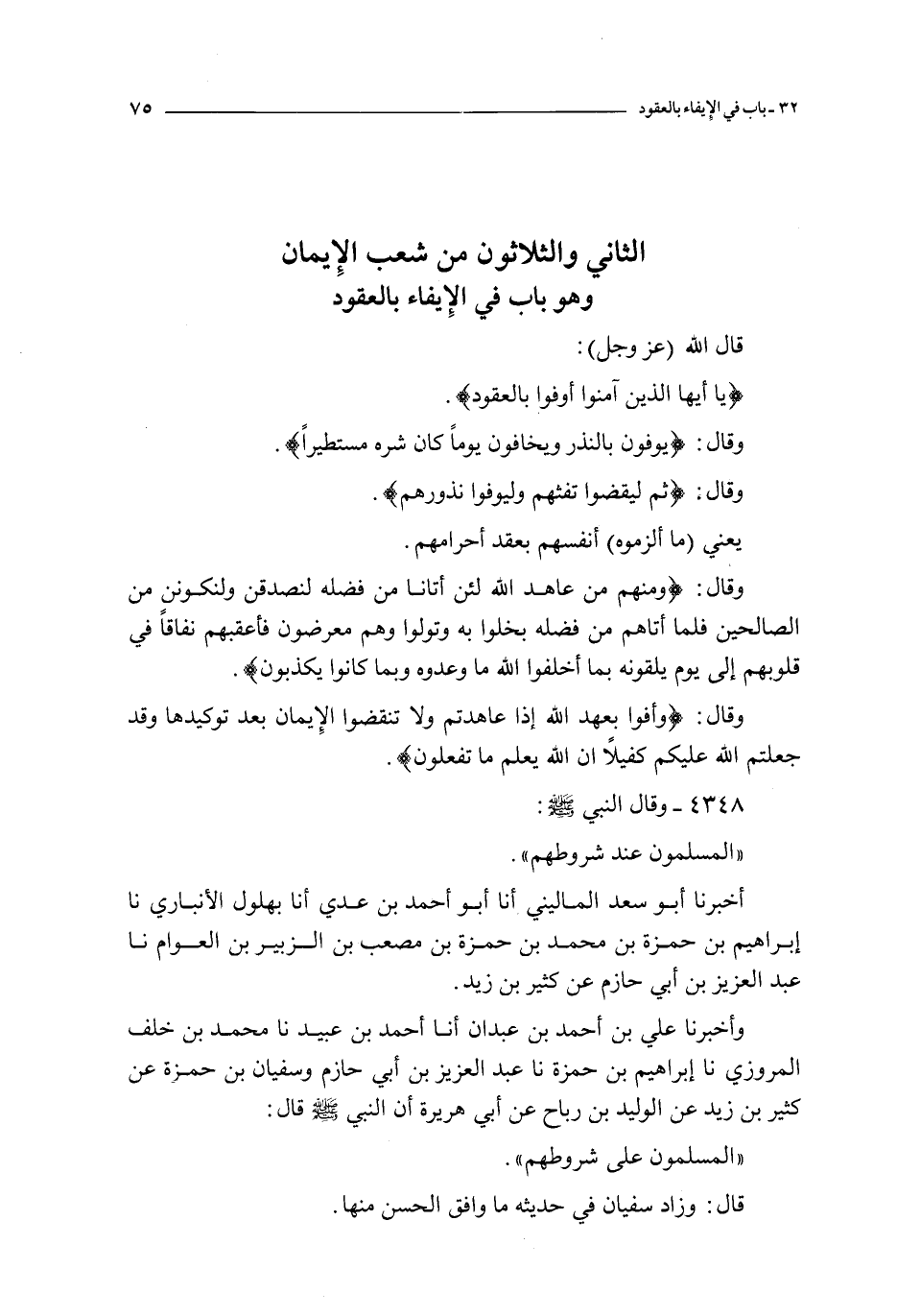 الثاني و الثلاثين من شعب الإيمان و هو باب في الإيفاء بالعقود قال الله عز و جل { يا أيها الذين آمنوا أوفوا بالعقود } و قال : { يوفون بالنذر ويخافون يوما كان شره مستطيرا } و قال : { ثم ليقضوا تفثهم وليوفوا نذورهم } يعني ما ألزموه أنفسهم بعقد أحرامهم و قال : { ومنهم من عاهد الله لئن آتانا من فضله لنصدقن ولنكونن من الصالحين } { فلما آتاهم من فضله بخلوا به وتولوا وهم معرضون } { فأعقبهم نفاقا في قلوبهم إلى يوم يلقونه بما أخلفوا الله ما وعدوه وبما كانوا يكذبون } و قال : { وأوفوا بعهد الله إذا عاهدتم ولا تنقضوا الأيمان بعد توكيدها وقد جعلتم الله عليكم كفيلا إن الله يعلم ما تفعلون }