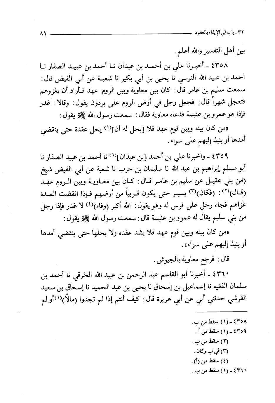 4359 - و أخبرنا علي بن أحمد بن عبدان نا أحمد بن عبيد الصفار نا أبو مسلم إبراهيم بن عبد الله نا سليمان بن حرب نا شعبة عن أبي الفيض شيخ من بني عقيل عن سليم بن عامر قال : كان بين معاوية و بين الروم عهد قال : فكان يسير حتى يكون قريبا من أرضهم فإذا انقضت المدة غزاهم فجاء رجل على فرس له و هو يقول : الله أكبر وفاء لا غدر فإذا رجل من بني سليم يقال له عمرو بن عنبسة قال : سمعت رسول الله صلى الله عليه و سلم يقول :