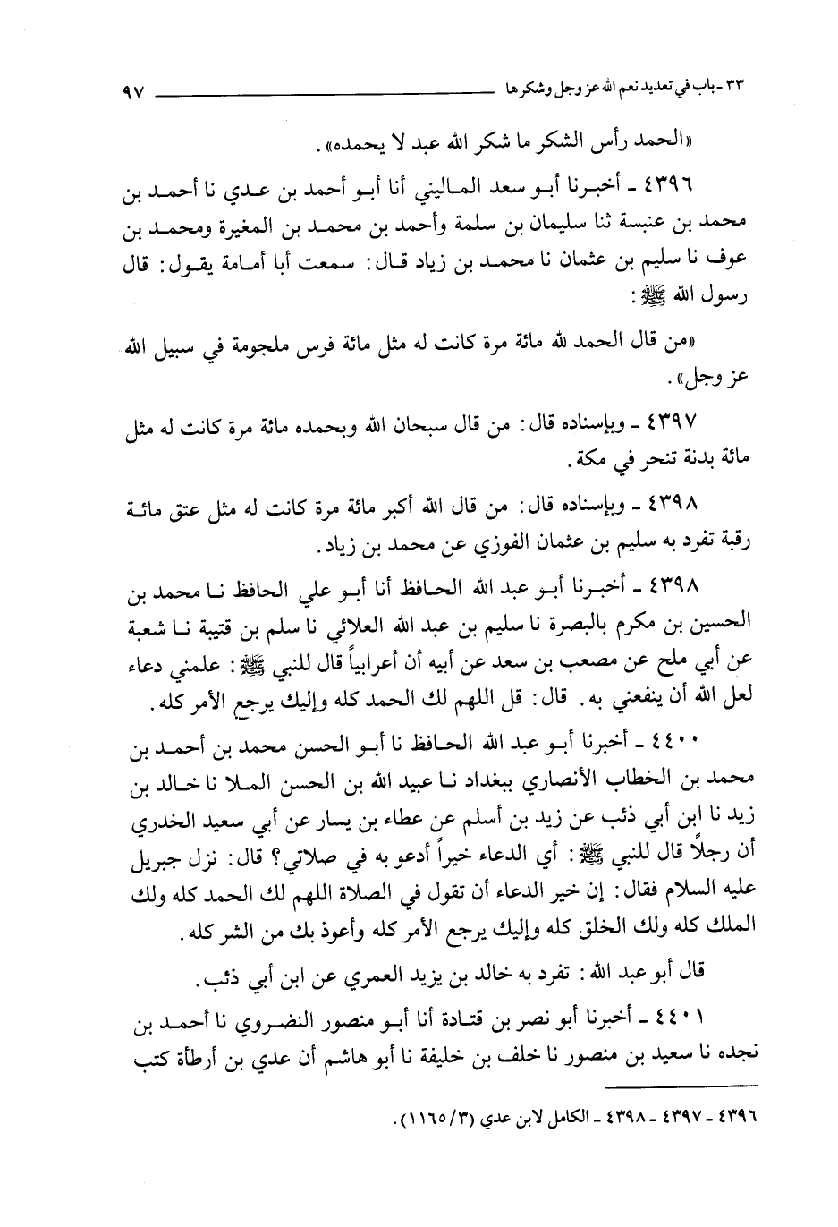 4397 - و بإسناده قال : من قال سبحان الله و بحمده مائة مرة كانت له مثل مائة بدنة تنحر في مكة