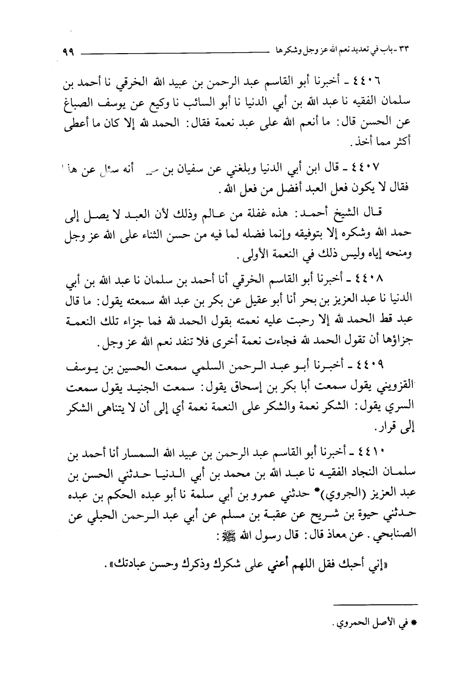 4409 - أخبرنا أبو عبد الرحمن السلمي سمعت الحسين بن يوسف القزويني يقول سمعت أبا بكر بن إسحاق يقول : سمعت الجنيد يقول سمعت السري يقول : الشكر نعمة و الشكر على النعمة نعمة أي إلى أن لا يتناهى الشكر إلى قرار