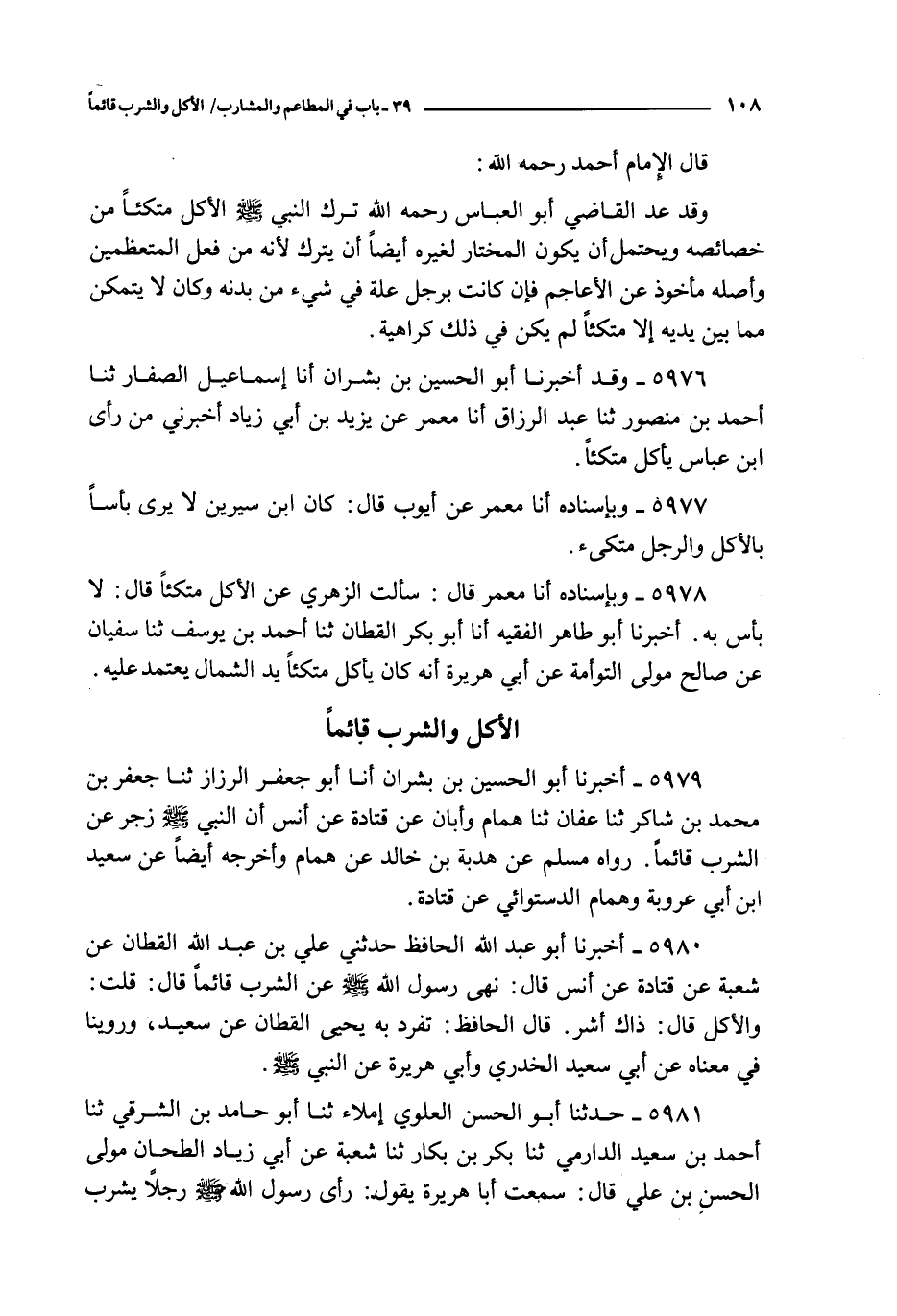 5976 - وقد أخبرنا أبو الحسين بن بشران أنا إسماعيل الصفار ثنا أحمد بن منصور ثنا عبد الرزاق أنا معمر عن يزيد بن أبي زياد أخبرني من رأى ابن عباس : يأكل متكئا