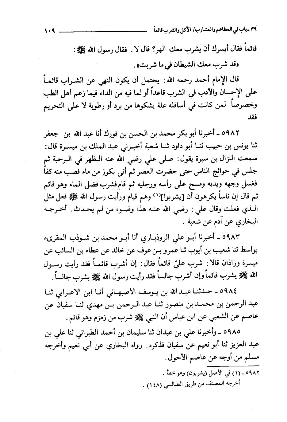 5983 - أخبرنا أبو علي الروذباري أنا محمد بن شوذب المقرئ بواسط ثنا شعيب بن أيوب ثنا عمرو بن عوف عن خالد عن عطاء بن السائب عن ميسرة و زادان قالا : شرب علي قائما فقال : إن أشرب قائما فقد رأيت رسول الله صلى الله عليه و سلم يشرب قائما وإن أشرب جالسا فقد رأيت رسول الله صلى الله عليه و سلم يشرب جالسا