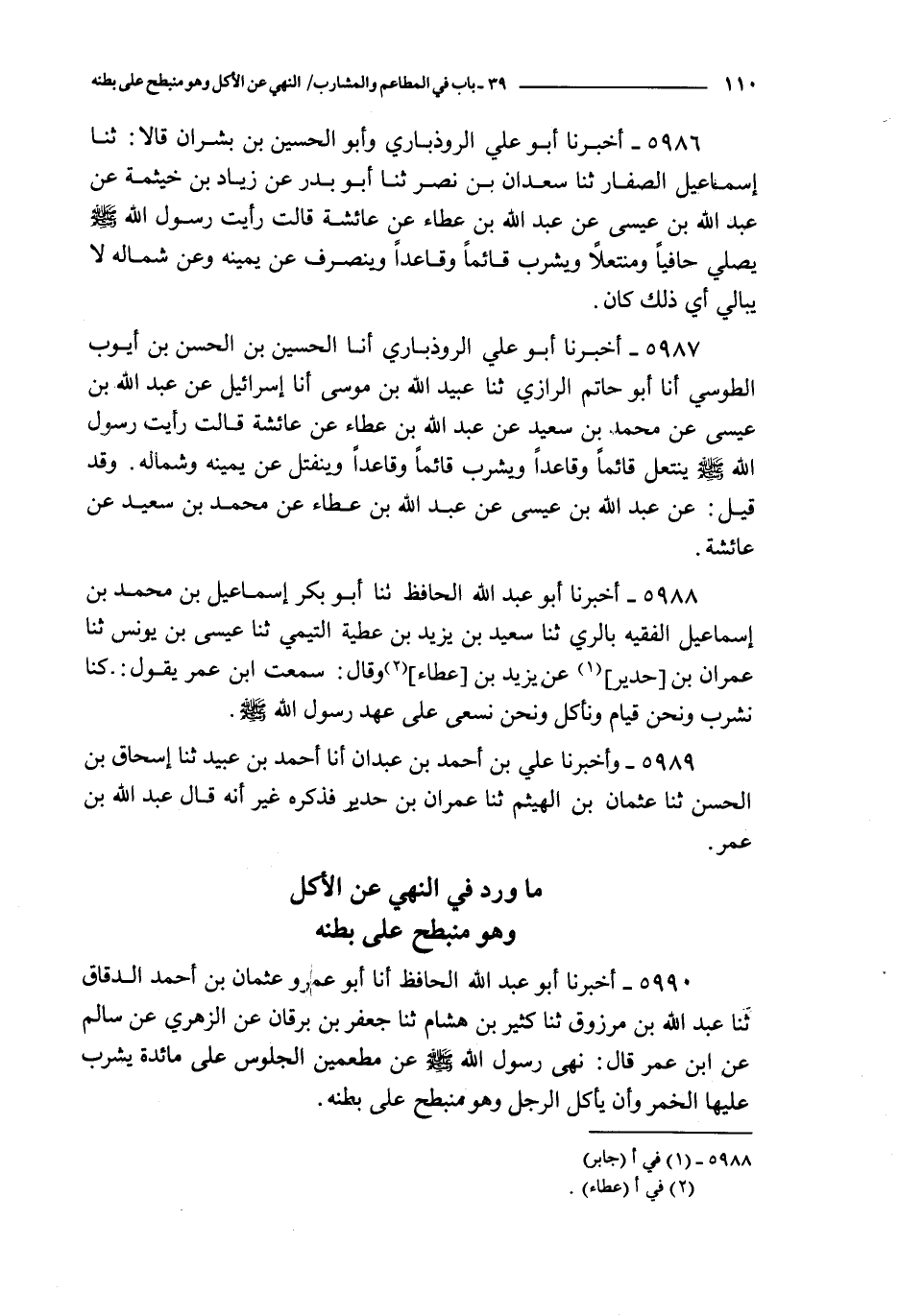 5986 - أخبرنا أبو علي الروذباري و أبو الحسين بن بشران قالا : ثنا إسماعيل الصفار ثنا سعدان بن نصر ثنا أبو بدر عن زياد بن خيثمة عن عبد الله بن عيسى عن عبد الله بن عطاء عن عائشة قالت : رأيت رسول الله صلى الله عليه و سلم يصلي حافيا ومنتعلا ويشرب قائما وينصرف عن يمينه وعن شماله لا يبالي أي ذلك كان