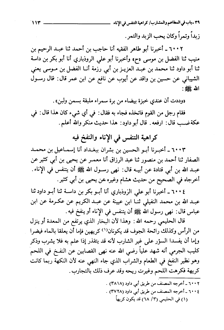 6004 - أخبرنا أبو علي الروذباري أنا أبو بكر بن داسة ثنا أبو داود ثنا عبد الله بن محمد النفيلي ثنا ابن عيينة عن عبد الكريم عن عكرمة عن ابن عباس قال : نهى رسول الله صلى الله عليه و سلم أن ييتنفس في الإناء أو ينفخ فيه