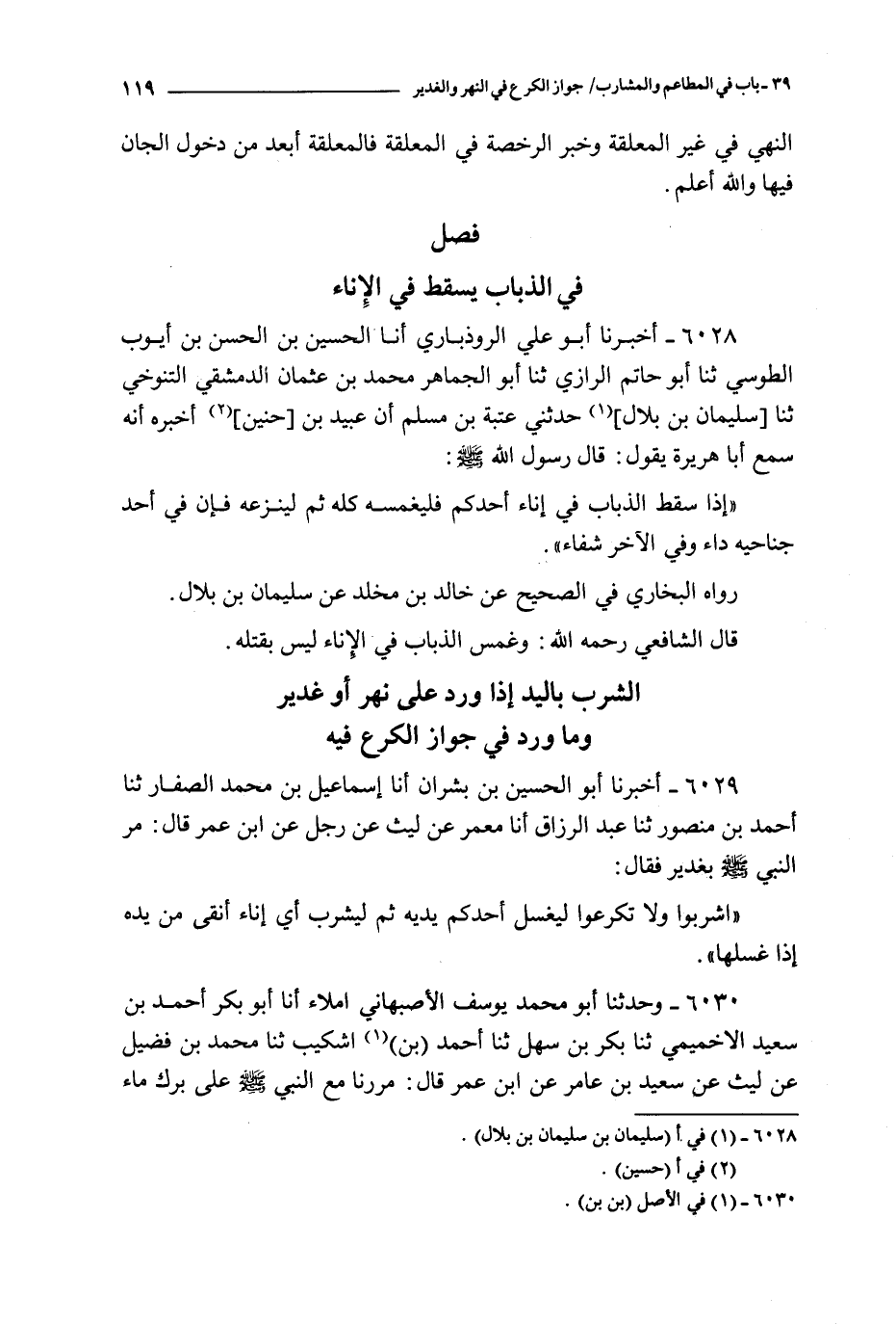 6030 - وحدثنا أبو محمد يوسف الأصبهاني إملاء أنا أبو بكر أحمد بن سعيد الاخميمي ثنا بكر بن سهل ثنا أحمد بن اشكيب ثنا محمد بن فضيل عن ليث عن سعيد بن عامر عن ابن عمر قال : مررنا مع النبي صلى الله عليه و سلم على برك ماء فجعلنا نكرع فيها فقال : لا تكرعوا فيها ولكن اغسلوا أيديكم واشربوا منها فليس من إناء أطيب من اليد لفظ حديث ابن يوسف وفي الرواية الأولى : كنا على سفر فانتهينا إلى بركة ماء سماء فكرعنا فيها فنهى النبي صلى الله عليه و سلم ثم قال :