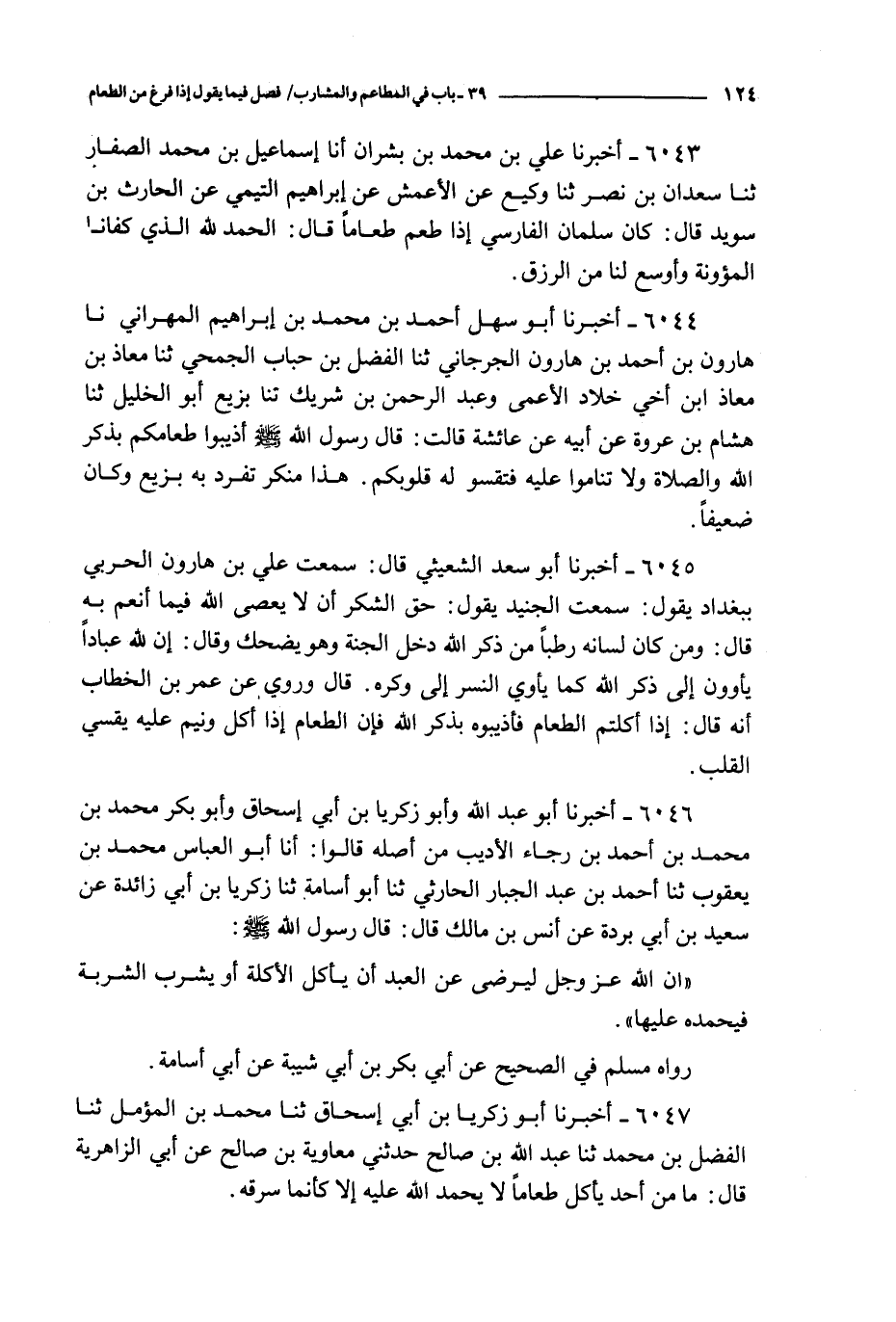 6043 - أخبرنا علي بن محمد بن بشران أنا إسماعيل بن محمد الصفار ثنا سعدان بن نصر ثنا وكيع عن الأعمش عن إبراهيم التيمي عن الحارث بن سويد قال : كان سلمان الفارسي إذا طعم طعاما قال : الحمد لله الذي كفانا المؤونة وأوسع لنا من الرزق