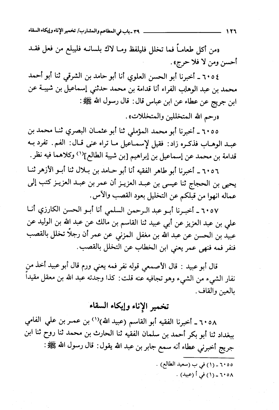 6055 - أخبرنا أبو محمد المؤملي ثنا أبو عثمان البصري ثنا محمد بن عبد الوهاب : فذكره زاد : فقيل لإسماعيل ما تراه عني قال : الفم تفرد به قدامة بن محمد عن إسماعيل بن إبراهيم بن شيبة الطالع وكلاهما فيه نظر