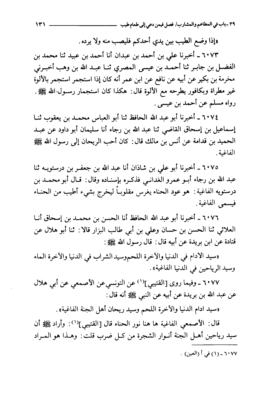 سيد الادام في الدنيا والآخرة اللحم وسيد الشراب في الدنيا والآخرة الماء وسيد الرياحين في الدنيا الفاغية