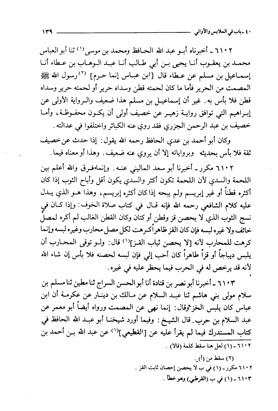 6102 - أخبرناه أبو عبد الله الحافظ و محمد بن موسى ثنا أبو العباس محمد بن يعقوب أنا يحيى بن أبي طالب أنا عبد الوهاب بن عطاء أنا إسماعيل بن مسلم عن عطاء قال ابن عباس : إنما حرم صلى الله عليه و سلم المصمت من الحرير فأما ما كان لحمته قطن وسداه حرير أو لحمته حرير وسداه قطن فلا بأس به غير أن إسماعيل بن مسلم هذا ضعيف والرواية الأولى عن إبراهيم التي توافق رواية الزهري عن خصيف أولى أن يكون محفوظة وأما خصيف بن عبد الرحمن الجزري فقد روي عنه الكبائر واختلفوا في عدالته