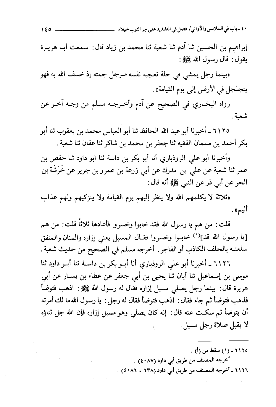 6126 - أخبرنا أبو علي الروذباري أنا أبو بكر بن داسة ثنا أبو داود ثنا موسى بن إسماعيل ثنا أبان ثنا يحيى بن أبي جعفر عن عطاء بن يسار عن أبي هريرة قال : بينما رجل يصلي مسبل إزاره فقال له رسول الله صلى الله عليه و سلم : اذهب فتوضأ فذهب فتوضأ ثم جاء فقال : اذهب فتوضأ فقال له رجل : يا رسول الله ما لك أمرته أن يتوضأ ثم سكت عنه قال : إنه كان يصلي وهو مسبل إزاره فإن الله عز و جل لا يقبل صلاة رجل مسبل