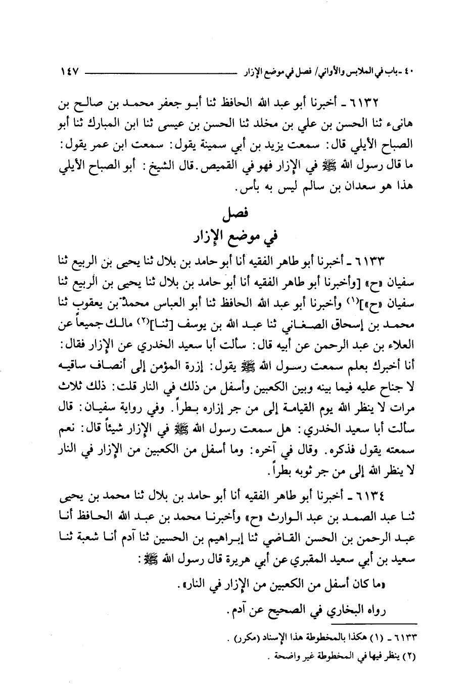 6133 - أخبرنا أبو طاهر الفقيه أنا أبو حامد بن بلال ثنا يحيى بن الربيع ثنا سفيان ح وأخبرنا أبو طاهر الفقيه أنا أبو حامد بن بلال ثنا يحيى بن الربيع ثنا سفيان ح وأخبرنا أبو عبد الله الحافظ ثنا أبو العباس محمد بن يعقوب ثنا محمد بن إسحاق الصغاني ثنا عبد الله بن يوسف ثنا مالك جميعا عن العلاء بن عبد الرحمن عن أبيه قال : سألت أبا سعيد الخدري عن الإزار فقال : أنا أخبرك بعلم سمعت رسول الله صلى الله عليه و سلم يقول :