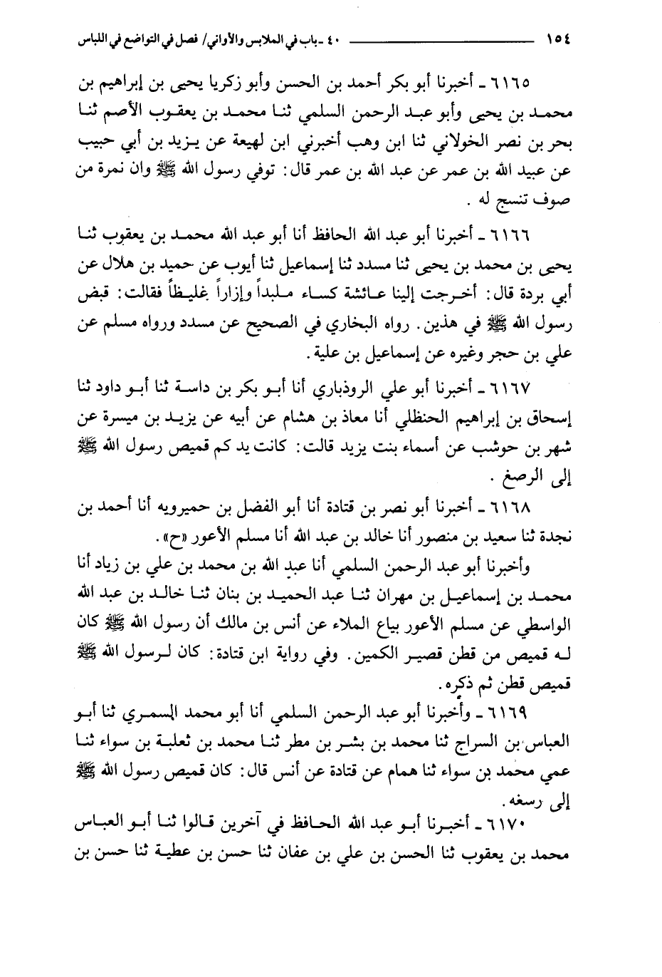 6169 - وأخبرنا أبو عبد الرحمن السلمي أنا أبو محمد السمري ثنا أبو العباس بن السراج ثنا محمد بن بشر بن مطر ثنا محمد بن ثعلبة بن سواء ثنا عمي محمد بن سواء ثنا همام عن قتادة عن أنس قال : كان قميص رسول الله صلى الله عليه و سلم رسول الله صلى الله عليه و سلم إلى رسغه