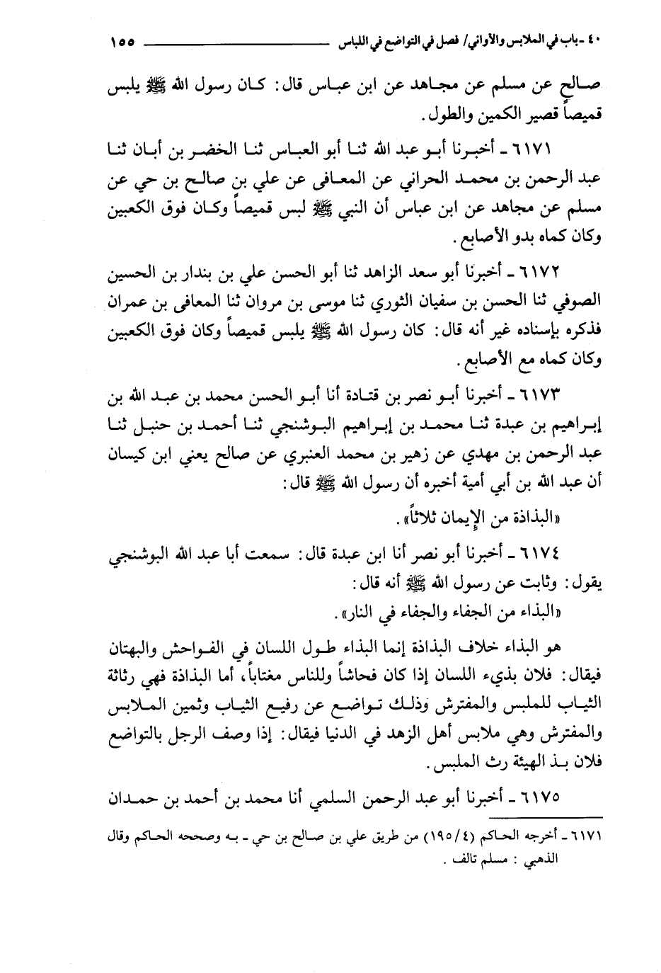 6171 - أخبرنا أبو عبد الله ثنا أبو العباس ثنا الخضر بن أبان ثنا عبد الرحمن بن محمد الحراني عن المعافي عن علي بن صالح بن حي عن مسلم عن مجاهد عن ابن عباس : أن النبي صلى الله عليه و سلم لبس قميصا وكان فوق الكعبين وكان كماه بدو الأصابع