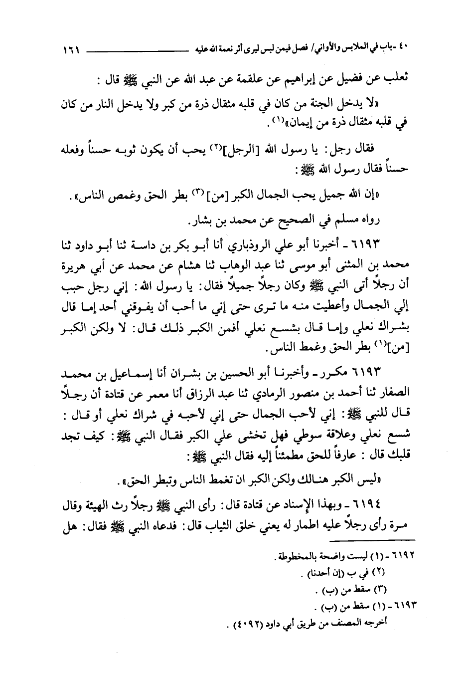 6193 - أخبرنا أبو علي الروذباري أنا أبو بكر بن داسة ثنا أبو داود ثنا محمد بن المثنى أبو موسى ثنا عبد الوهاب ثنا هشام عن محمد بن أبي هريرة : أن رجلا أتى النبي صلى الله عليه و سلم وكان رجلا جميلا فقال : يا رسول الله : إني رجل حبب إلي الجمال وأعطيت منه ما ترى حتى إني ما أحب أن يفوقني أحد إما قال بشراك نعلي وإما قال بشسع نعلي أفمن الكبر ذلك قال : لا ولكن الكبر من بطر الحق وغمط الناس