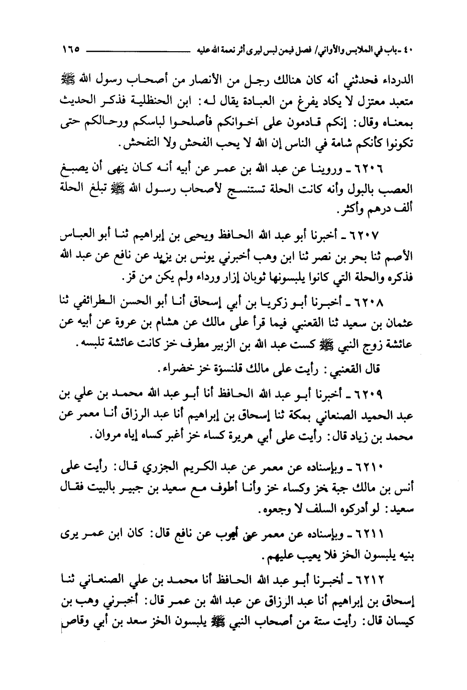 6211 - وبإسناده عن معمر عن أيوب عن نافع قال : كان ابن عمر يرى بنيه يلبسون الخز فلا يعيب عليهم