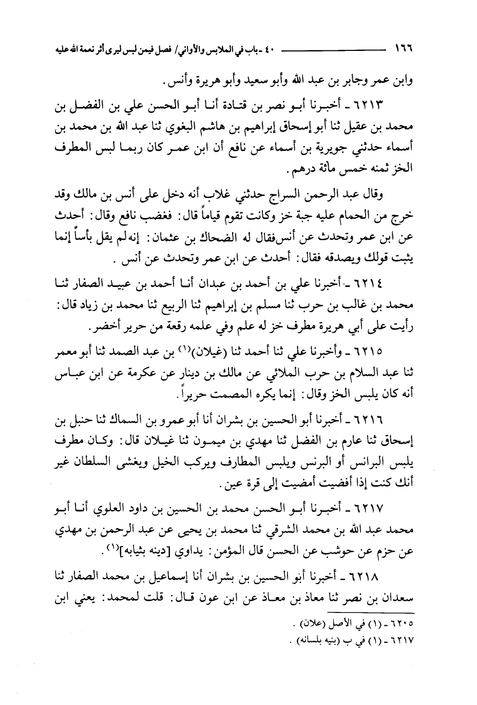 6218 - أخبرنا أبو الحسين بن بشران أنا إسماعيل بن محمد الصفار ثنا سعدان بن نصر ثنا معاذ بن معاذ عن ابن عون قال : قلت لمحمد : يعني ابن سيرين : كان يلبسون الخز قال : كانوا يلبسونه ويكرهونه ويرجون رحمة الله عز و جل