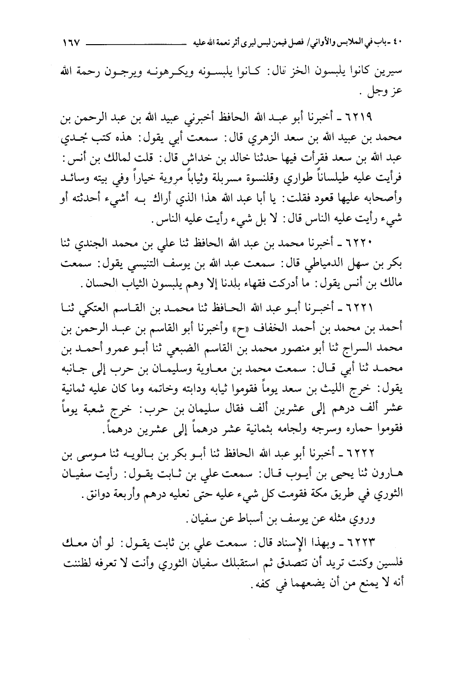 6220 - أخبرنا محمد بن عبد الله الحافظ ثنا علي بن محمد الحندي ثنا بكر بن سهل الدمياطي قال : سمعت عبد الله بن يوسف التنيسي يقول : سمعت مالك بن أنس يقول : ما أدركت فقهاء بلدنا إلا وهم يلبسون الثياب الحسان