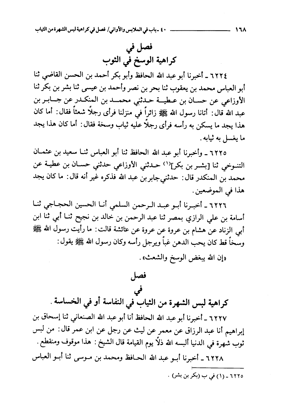 6224 - أخبرنا أبو عبد الله الحافظ و أبو بكر أحمد بن الحسن القاضي ثنا أبو العباس محمد بن يعقوب ثنا بحر بن نصر و أحمد بن عيسى ثنا بشر بن بكر ثنا الأوزاعي عن حسان بن عطية حدثني محمد بن المنكدر عن جابر بن عبد الله قال : أتانا رسول الله صلى الله عليه و سلم زائرا في منزلنا فرأى رجلا شعثا فقال : أما كان هذا يجد ما يسكن به رأسه فرأى رجلا عليه ثياب وسخة فقال : أما كان هذا يجد ما يغسل به ثيابه
