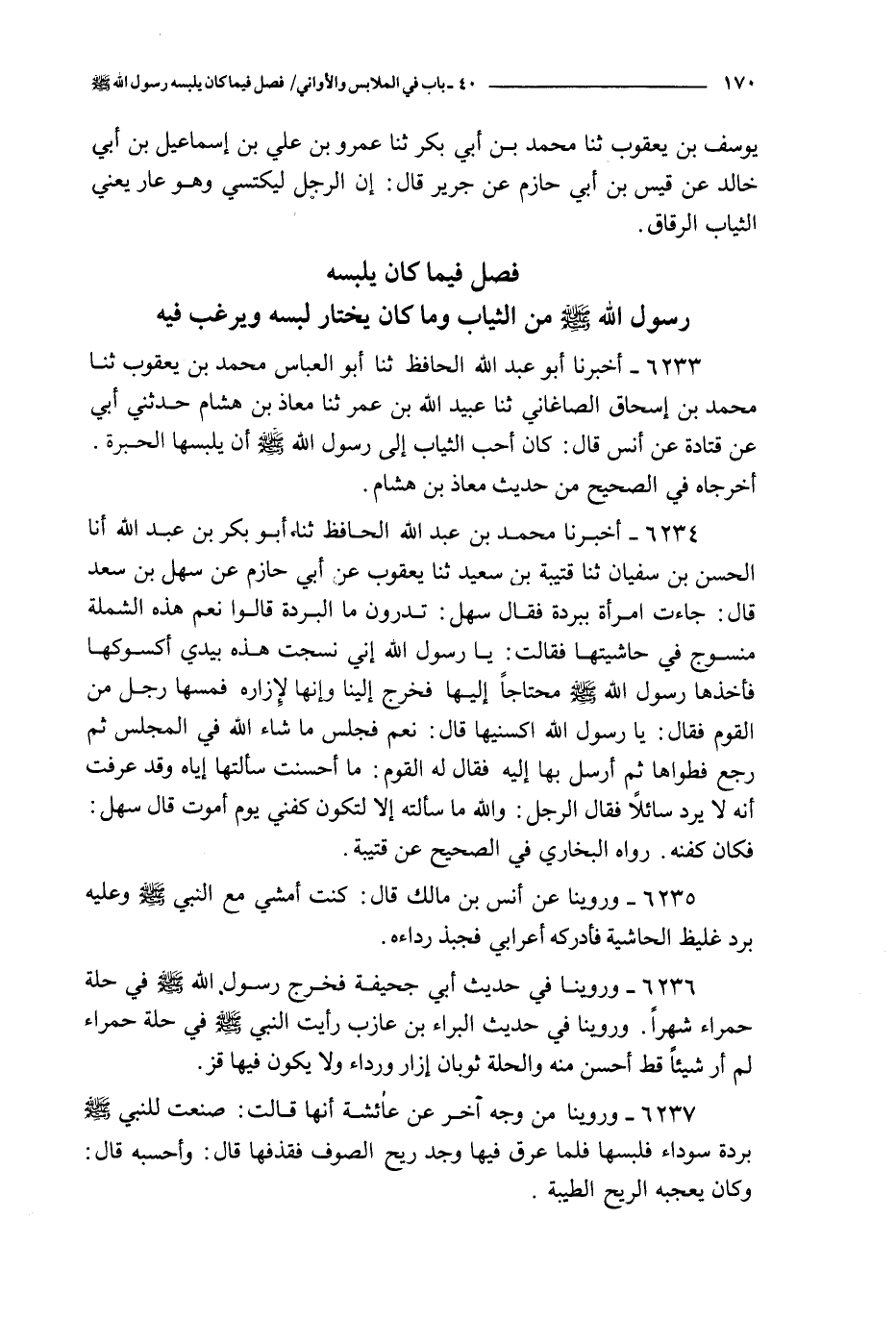 6233 - أخبرنا أبو عبد الله الحافظ ثنا أبو العباس محمد بن يعقوب ثنا محمد بن إسحاق الصاغاني ثنا عبيد الله بن عمر ثنا معاذ بن هشام حدثني أبي عن قتادة عن أنس قال : كان أحب الثياب إلى رسول الله صلى الله عليه و سلم أن يلبسها الحبرة