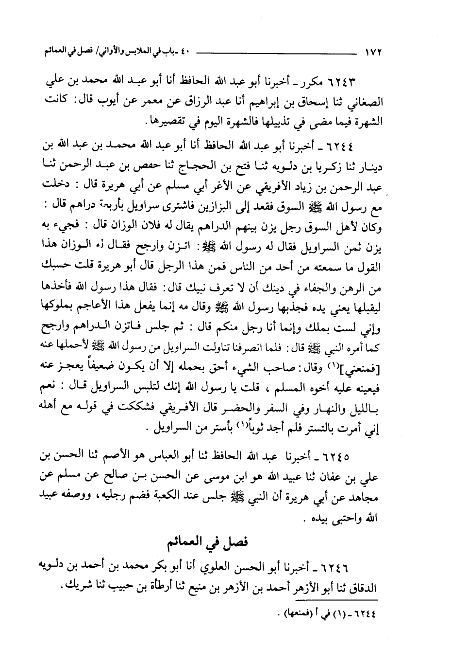 6244 - أخبرنا أبو عبد الله الحافظ أنا أبو عبد الله محمد بن عبد الله بن دينار ثنا زكريا بن دلويه ثنا فتح بن الحجاج ثنا حفص بن عبد الرحمن ثنا عبد الرحمن بن زياد الأفريقي عن الأغر أبي مسلم عن أبي هريرة قال : دخلت مع رسول الله صلى الله عليه و سلم السوق فقعد إلى البزازين فاشترى سراويل بأربعة دراهم قال : وكان لأهل السوق رجل يزن بينهم الدراهم يقال له فلان الوزان قال : فجيء به يزن ثمن السراويل فقال له رسول الله صلى الله عليه و سلم : اتزن وارجع فقال له الوزان هذا القول ما سمعته من أحد من الناس فمن هذا الرجل قال أبو هريرة قلت حسبك من الرهن والجفاء في دينك أن لا تعرف نبيك قال : فقال رسول الله فأخذها ليقبلها يعني يده فجذبها رسول الله صلى الله عليه و سلم وقال مه إنما يفعل هذا الأعاجم بملوكها وإني لست بملك وإنما أنا رجل منكم قال : ثم جلس فاتزن الدراهم وارجح كما أمره النبي صلى الله عليه و سلم قال : فلما انصرفنا تناولت السراويل من رسول الله صلى الله عليه و سلم لأحملها عنه فمنعني وقال : صاحب الشيء أحق بحمله إلا أن يكون ضعيفا بعجز عنه فيعينه عليه أخوه المسلم قلت يا رسول الله إنك لتلبس السراويل قال : نعم بالليل والنهار وفي السفر والحضر قال الأفريقي فشككت في قوله مع أهله إني أمرت بالتستر فلم أجد ثوبا بأستر من السراويل