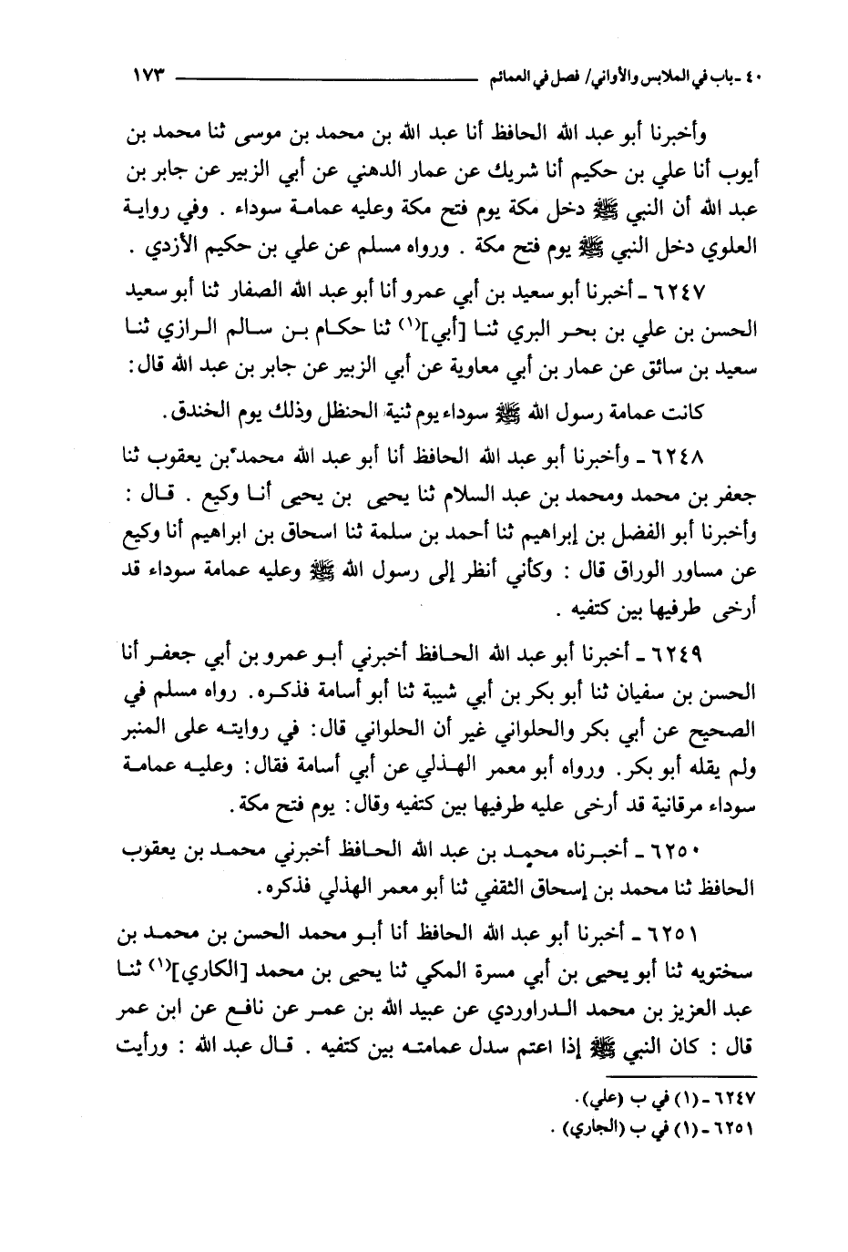 6251 - أخبرنا أبو عبد الله الحافظ أنا أبو محمد الحسن بن محمد بن سختويه ثنا أبو يحيى بن أبي ميسرة المكي ثنا يحيى بن محمد الكاري ثنا عبد العزيز بن محمد الدراوردي عن عبيد الله بن عمر عن نافع عن ابن عمر قال : كان النبي صلى الله عليه و سلم إذا اعتم سدل عمامته بين كتفيه قال عبد الله : ورأيت القاسم و سالم يفعلان ذلك قال نافع رأيت عبد الله يسدل عمامته من خلف تابعه أبو مصعب عن الدراوردي