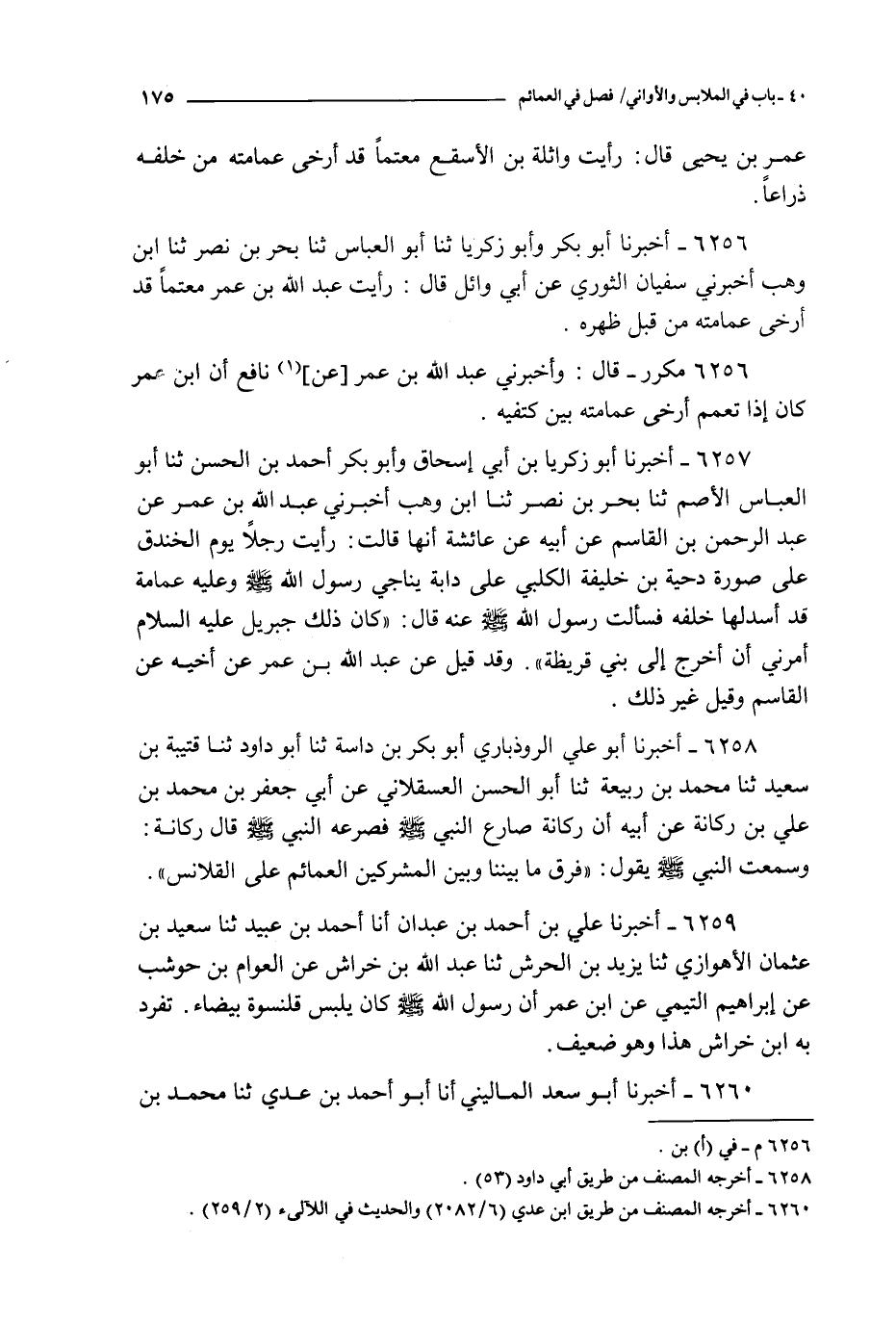 6256 - أخبرنا أبو بكر و أبو زكريا ثنا أبو العباس ثنا بحر بن نصر ثنا ابن وهب أخبرني سفيان الثوري عن أبي وائل قال : رأيت عبد الله بن عمر معتما قد أرخى عمامته من قبل ظهره