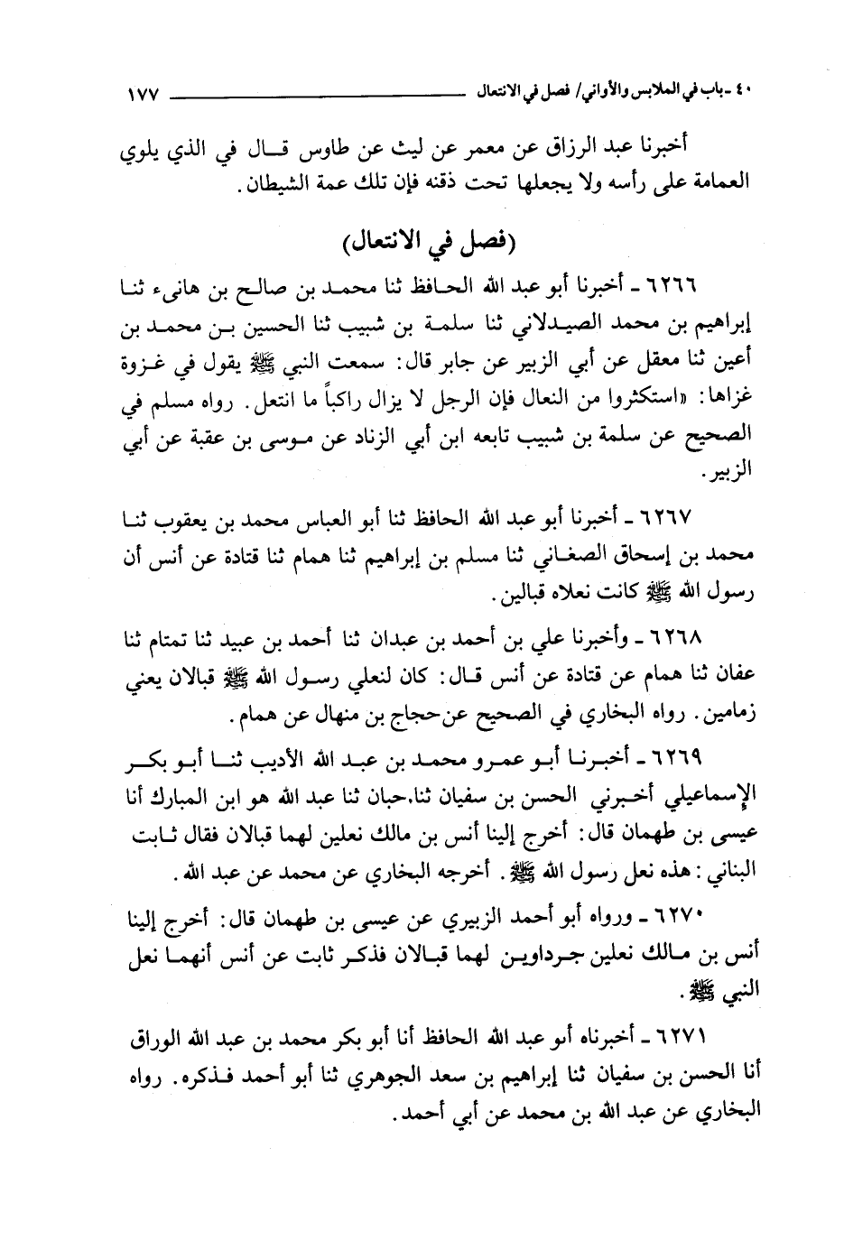 6269 - أخبرنا أبو عمرو محمد بن عبد الله الأديب ثنا أبو بكر الإسماعيلي أخبرني الحسن بن سفيان ثنا حبان ثنا عبد الله هو ابن المبارك أنا عيسى بن طهمان قال : أخرج إلينا أنس بن مالك نعلين لهما قبالان فقال ثابت البناني : هذه تعل رسول الله صلى الله عليه و سلم أخرجه البخاري عن محمد عن عبد الله