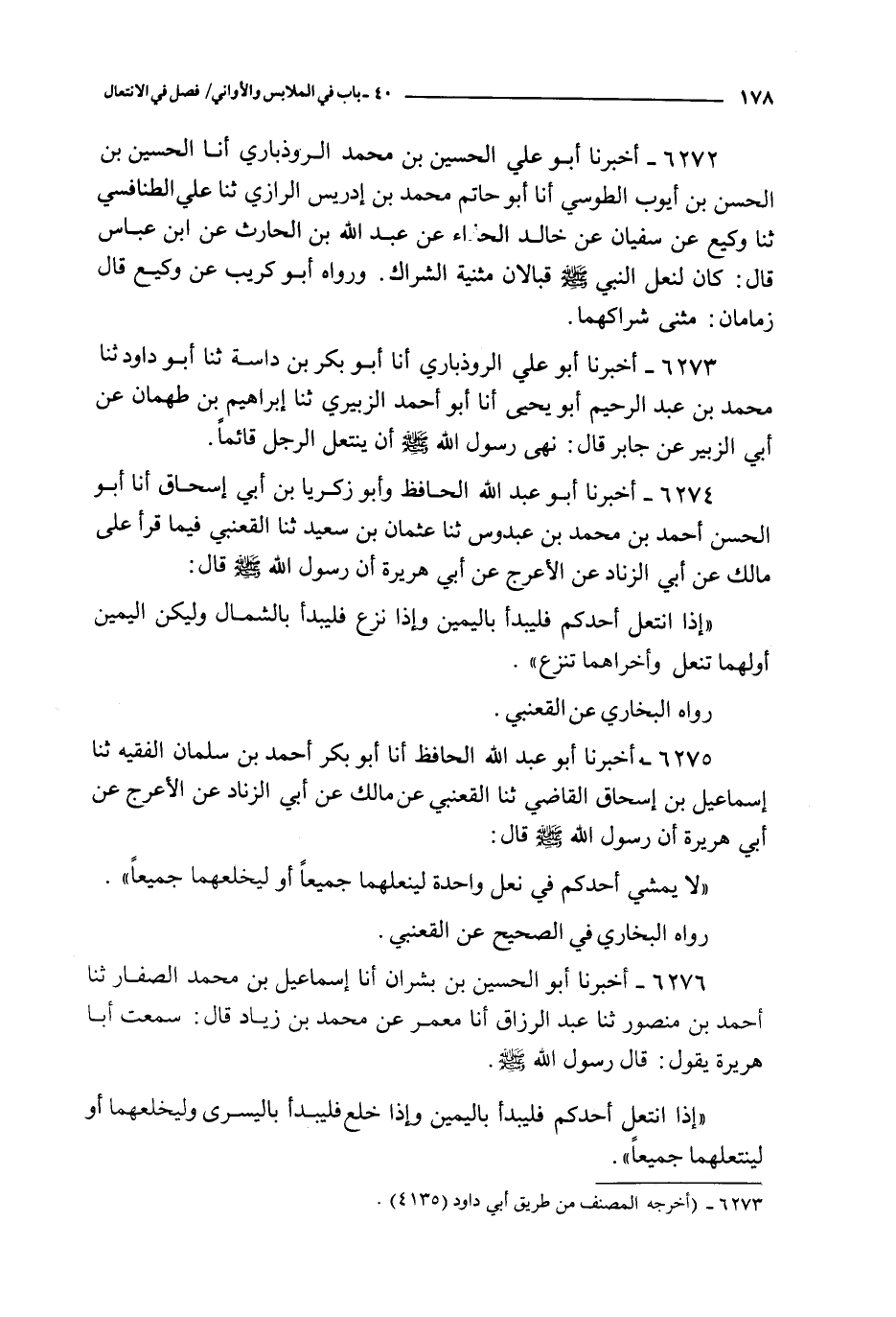 6273 - أخبرنا أبو علي الروذباري أنا أبو بكر بن داسة ثنا أبو داود ثنا محمد بن عبد الرحيم أبو يحيى أنا أبو أحمد الزبيري ثنا إبراهيم بن طهمان عن أبي الزبير عن جابر قال : نهى رسول الله صلى الله عليه و سلم أن ينتعل الرجل قائما