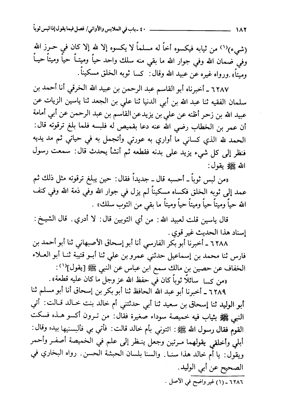 من لبس ثوبا ـ أحسبه قال ـ جديدا فقال : حين بلغ ترقوته مثل ذلك عمد إلى ثوبه الخلق فكساه مسكينا لم يزل في جوار الله وفي ذمة الله وفي كنف الله حيا وميتا حيا وميتا حيا وميتا وما بقي من الثوب سلك