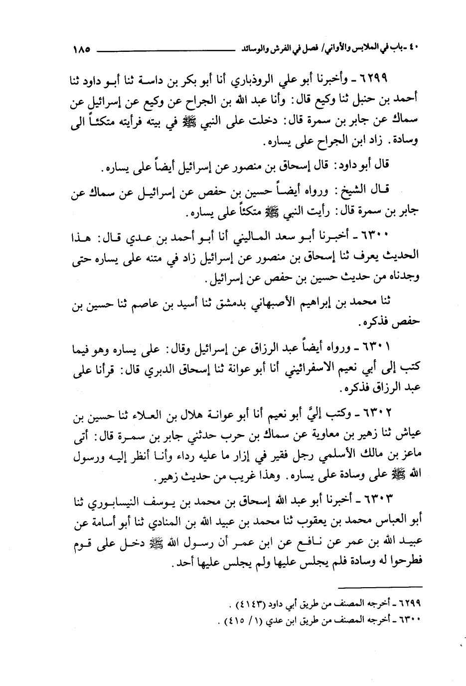 6299 - و أخبرنا أبو علي الروذباري أنا أبو بكر بن داسة ثنا أبو داود ثنا أحمد بن حنبل ثنا وكيع قال : و أنا عبد الله بن الجراح عن وكيع عن إسرائيل عن سماك عن جابر بن سمرة قال : دخلت على النبي صلى الله عليه و سلم في بيته فرأيته متكئا إلى وسادة زاد ابن الجراح على يساره