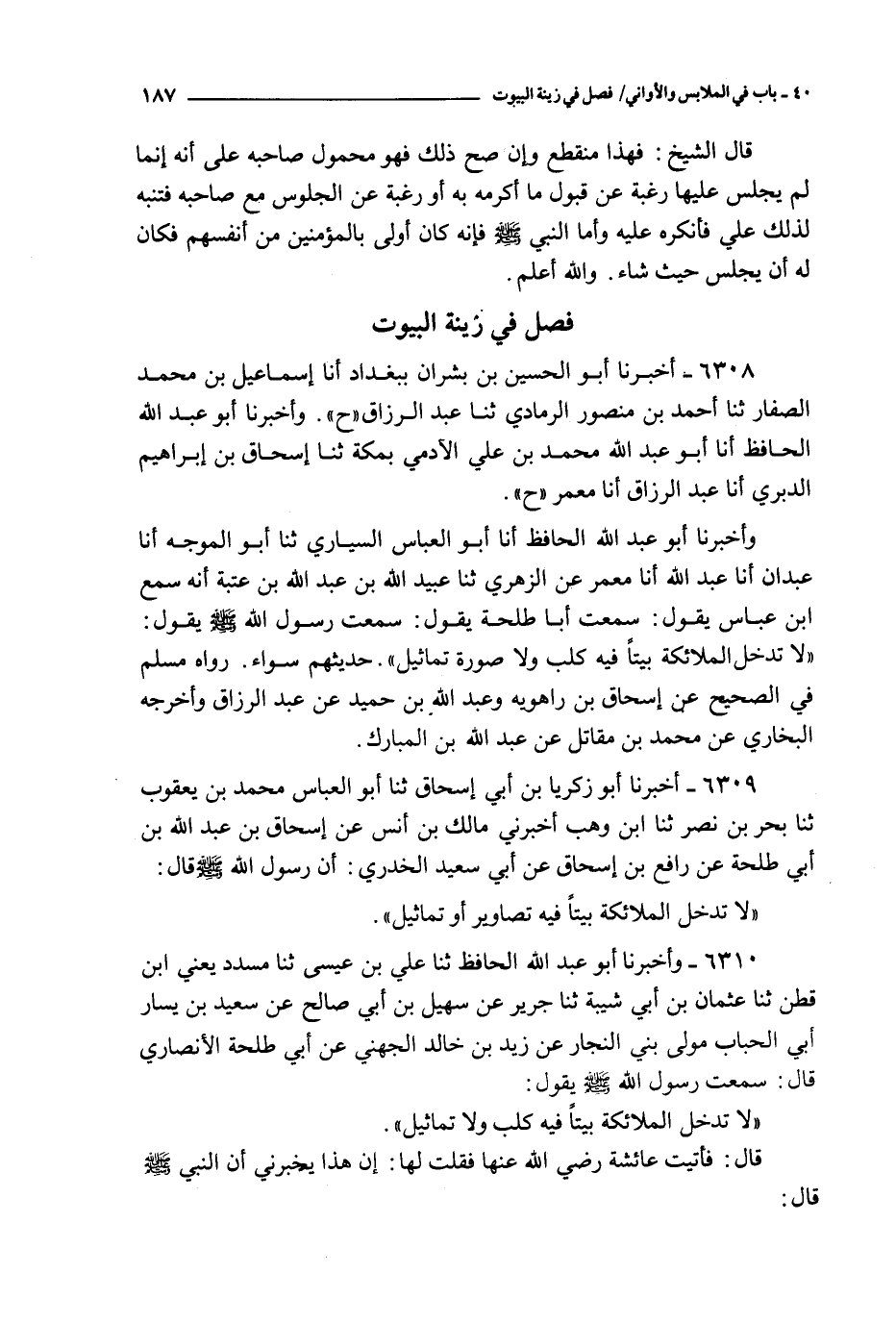 و أخبرنا أبو عبد الله الحافظ أنا أبو العباس اليساري ثنا أبو الموجه أنا عبدان أنا عبد الله أنا معمر عن الزهري ثنا عبيد الله بن عبد الله بن عتبة أنه سمع ابن عباس يقول : سمعت أبا طلحة يقول : سمعت رسول الله صلى الله عليه و سلم يقول : لا تدخل الملائكة بيتا فيه كلب ولا صورة تماثيل حديثهم سواء رواه مسلم في الصحيح عن إسحاق بن راهويه و عبد الله بن حميد عن عبد الرزاق وأخرجه البخاري عن محمد بن مقاتل عن عبد الله بن المبارك