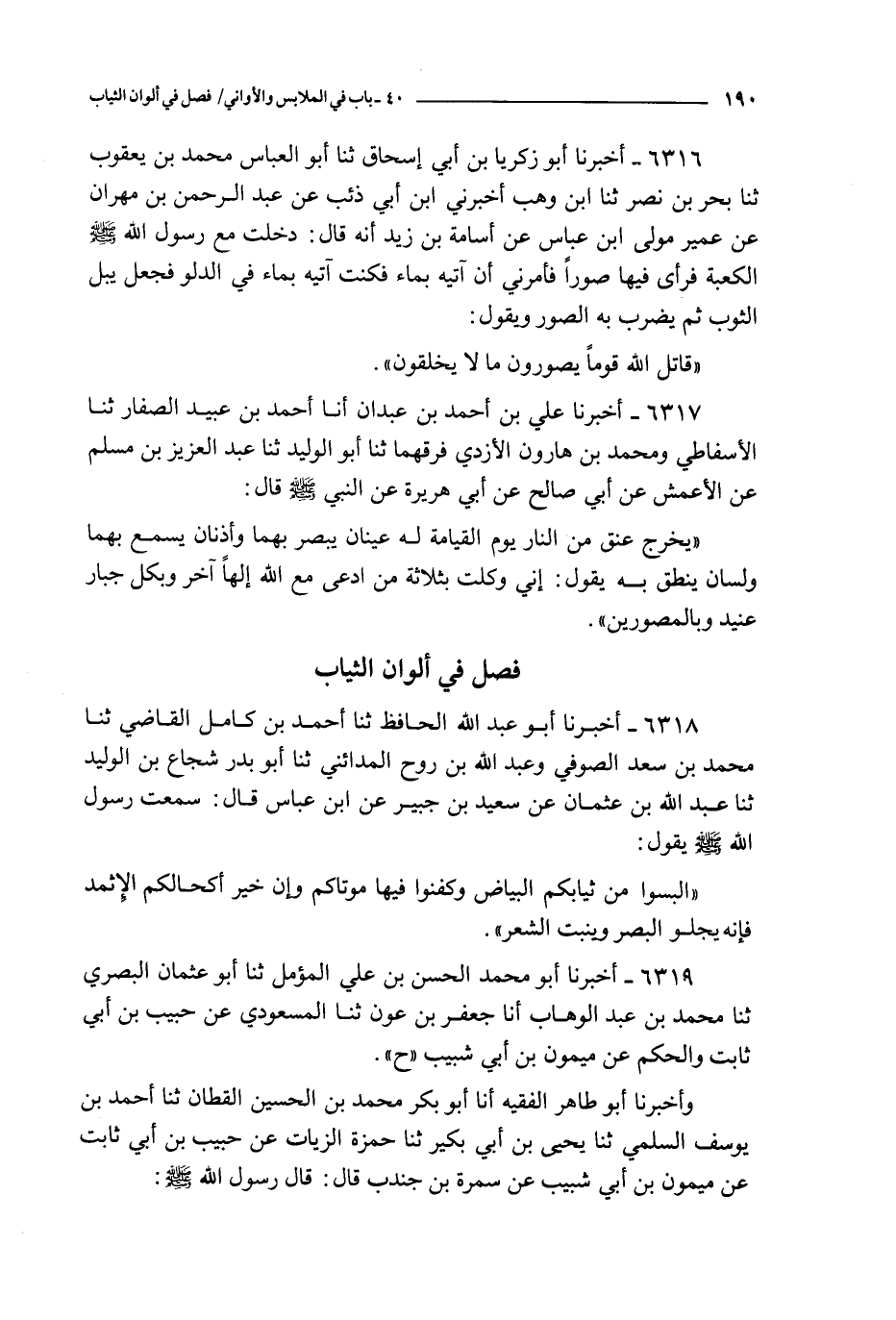 6316 - أخبرنا أبو زكريا بن أبي إسحاق ثنا أبو العباس محمد بن يعقوب ثنا بحر بن نصر ثنا ابن وهب أخبرني ابن أبي ذئب عن عبد الرحمن بن مهران عن عمير مولى ابن عباس عن أسامة بن زيد أنه قال : دخلت على رسول الله صلى الله عليه و سلم الكعبة فرأى فيها صورا فأمرني أن آتيه بماء فكنت آتيه بماء في الدلو فجعل يبل الثوب ثم يضرب به الصور ويقول :
