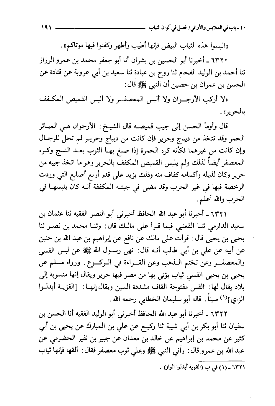 6321 - أخبرنا أبو عبد الله الحافظ أخبرني أبو النضر الفقيه ثنا عثمان بن سعيد الدارمي ثنا القعنبي فيما قرأ على مالك قال : وثنا محمد بن نصر ثنا يحيى بن يحيى قال : قرأت على مالك عن نافع عن إبراهيم بن عبد الله بن حنين عن أبيه عن علي بن أبي طالب أنه قال : نهى رسول الله صلى الله عليه و سلم عن لبس القسي والمعصفر وعن تختم الذهب وعن القراءة في الركوع ورواه مسلم عن يحيى بن يحيى القسي ثياب يؤتى بها من مصر فيها حرير ويقال إنها منسوبة إلى بلاد يقال لها : القس مفتوحة القاف مشددة السين ويقال إنها : القزية أبدلوا الزاي سينا قال أبو سليمان الخطابي رحمه الله