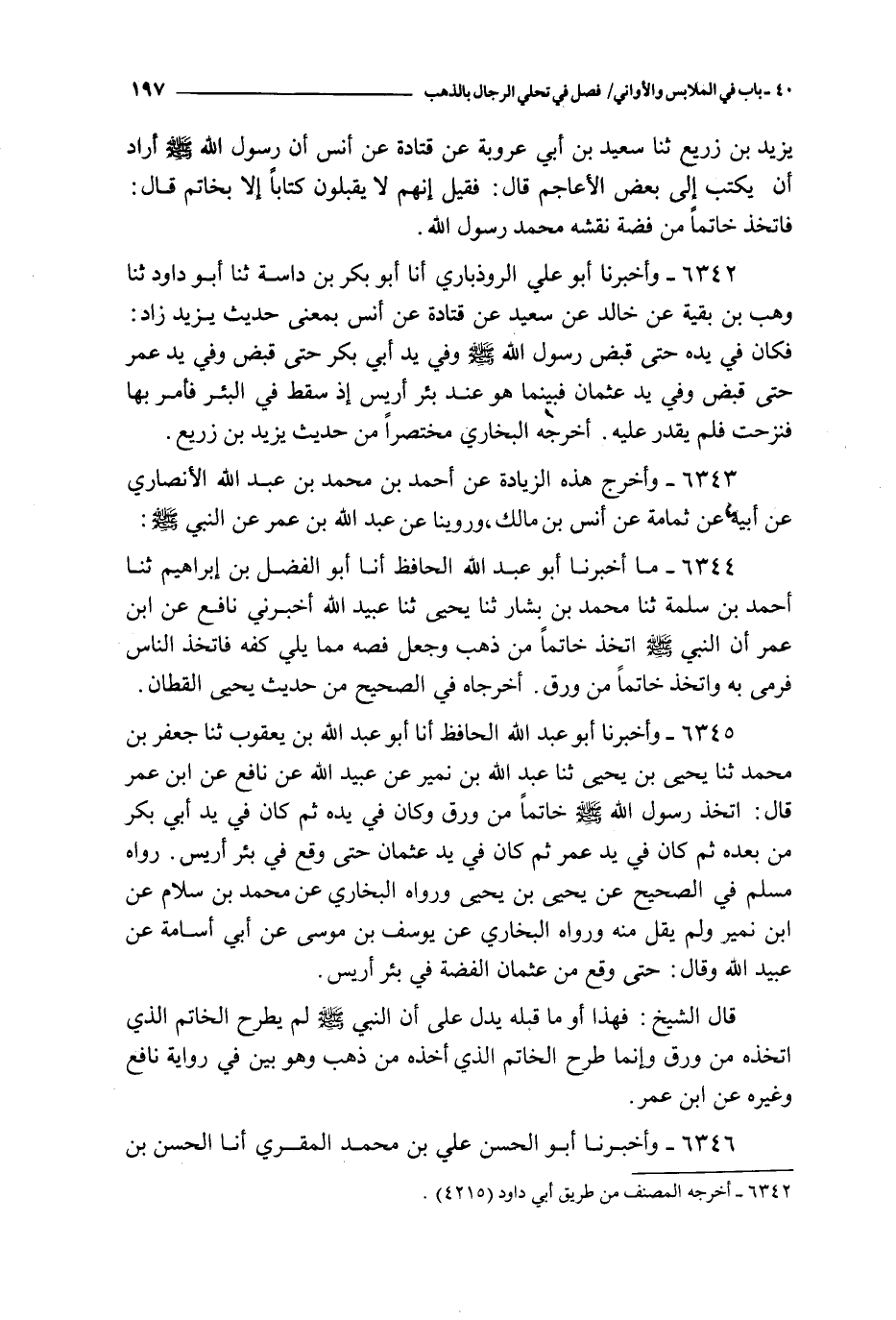 قال الشيخ : فهذا أو ما قبله يدل على أن النبي صلى الله عليه و سلم لم يطرح الخاتم الذي اتخذه من ورق وإنما طرح الخاتم الذي أخذه من ذهب وهو بين في رواية نافع وغيره عن ابن عمر