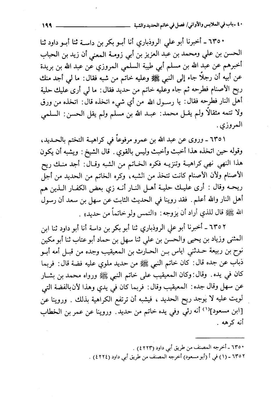 6352 - أخبرنا أبو علي الروذباري ثنا أبو بكر بن داسة ثنا أبو داود ثنا ابن المثنى و زياد بن يحيى و الحسن بن علي ثنا سهل بن حماد أبو عتاب ثنا أبو مكين نوح بن ربيعة حدثني إياس بن الحارث بن المعيقيب و جده من قبل أمه أبو ذباب عن جده قال : كان خاتم النبي صلى الله عليه و سلم من حديد ملوي عليه فضة قال : فربما كان في يده وقال : وكان المعيقيب على خاتم النبي صلى الله عليه و سلم ورواه محمد بن بشار عن سهل وقال جده : المعيقيب وقال : فربما كان في يدي وهذا لأن الفضة التي لويت عليه لا يوجد ريح الحديد فيشبه أن ترتفع الكراهية بذلك وروينا عن ابن مسعود أنه رئي وفي يده خاتم من حديد وروينا عن عمر بن الخطاب أنه كرهه