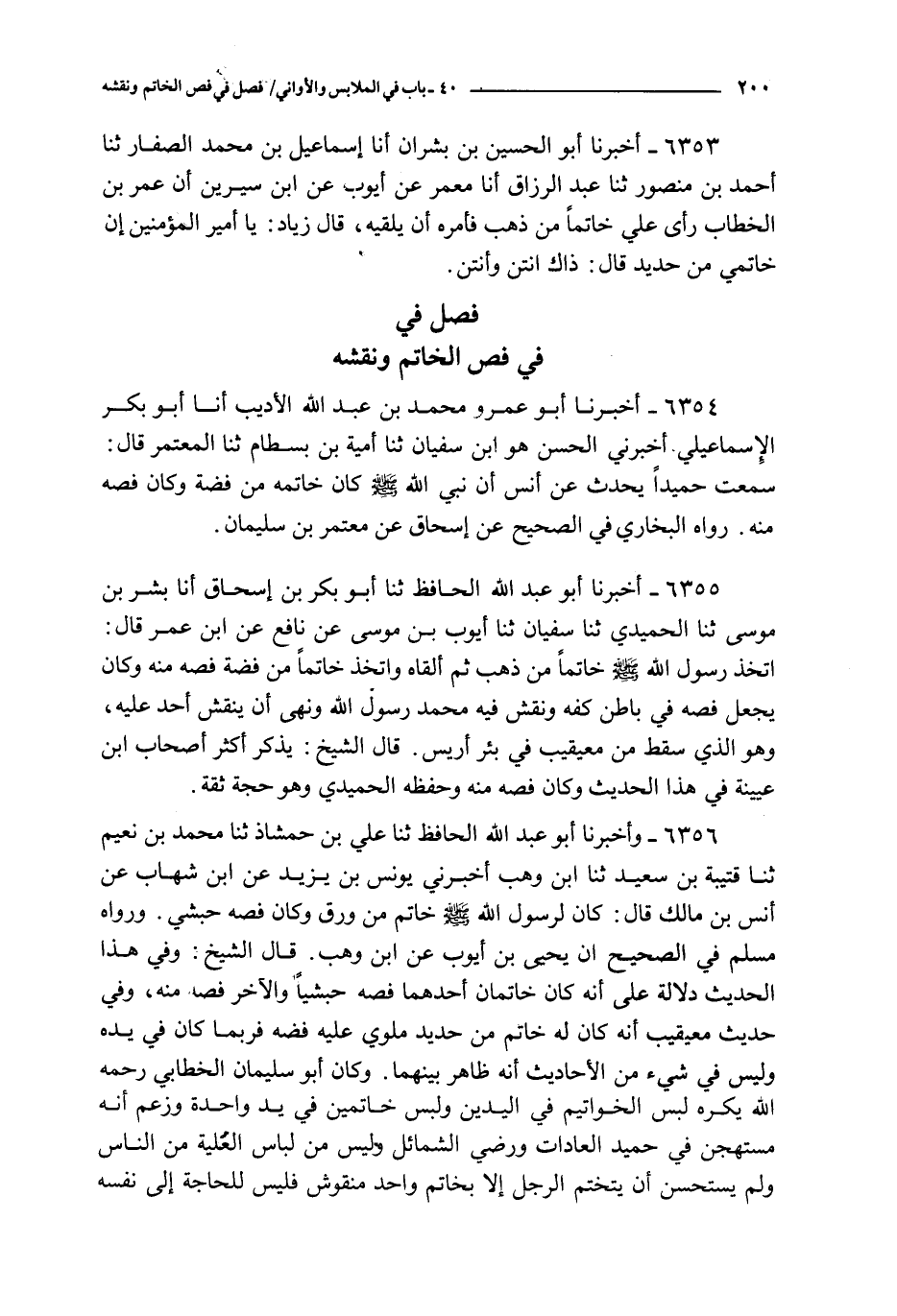 6356 - و أخبرنا أبو عبد الله الحافظ ثنا علي بن حمشاذ ثنا محمد بن نعيم ثنا قتيبة بن سعيد ثنا ابن وهب أخبرني يونس بن يزيد عن ابن شهاب عن أنس بن مالك قال : كان لرسول الله صلى الله عليه و سلم خاتم من ورق وكان فصه حبشي ورواه مسلم في الصحيح أنا يحيى بن يحيى عن ابن وهب قال الشيخ : وفي هذا الحديث دلالة على أنه كان خاتمان أحدهما فصه حبشيا والآخر فصه منه وفي حديث معيقيب أنه كان له خاتم من حديد ملوي عليه فضه فربما كان في يده وليس في شيء من الأحاديث أنه ظاهر بينهما وكان أبو سليمان الخطابي رحمه الله يكره لبس الخواتيم في اليدين ولبس خاتمين في يد واحدة وزعم أنه مستهجن في حميد العادات ورضي الشمائل وليس من لباس العلية من الناس ولم يستحسن أن يتختم الرجل إلا بخاتم واحد منقوش فليس للحاجة إلى نفسه لا لحسنه وبهجة لونه