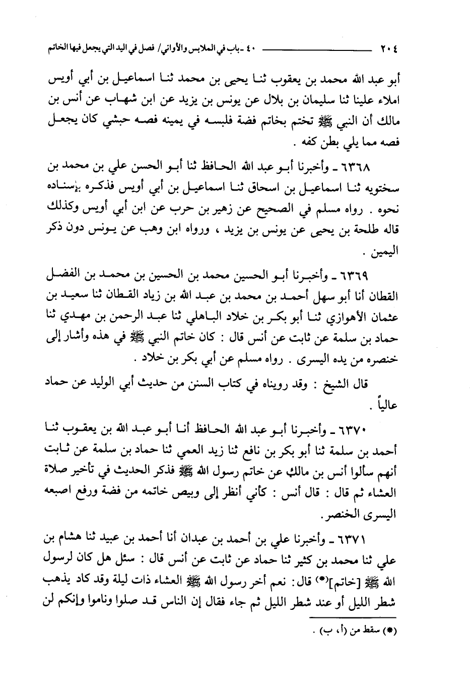 6371 - وأخبرنا علي بن أحمد بن عبدان أنا أحمد بن عبيد ثنا هشام بن علي ثنا محمد بن كثير ثنا حماد عن ثابت عن أنس قال : سئل هل كان لرسول الله صلى الله عليه و سلم خاتم قال : نعم أخر رسول الله صلى الله عليه و سلم العشاء ذات ليلة وقد كان يذهب شطر الليل أو عند شطر الليل ثم جاء فقال إن الناس قد صلوا وناموا وإنكم لن تزالوا في صلاة ما انتظرتم الصلاة قال أنس كأني أنظر إلى وبيض خاتمه من فضة وأشار بيده اليسرى ووصف قال الشيخ : وهذا أصح من رواية الزهري عن أنس : أنه طرح ما اتخذه من ورق وذلك غلط بالإجماع فيشبه أن يكون ذكر اليمين في الذي اتخذه من ذهب وهو الذي طرحه كما روينا من حديث ابن عمر