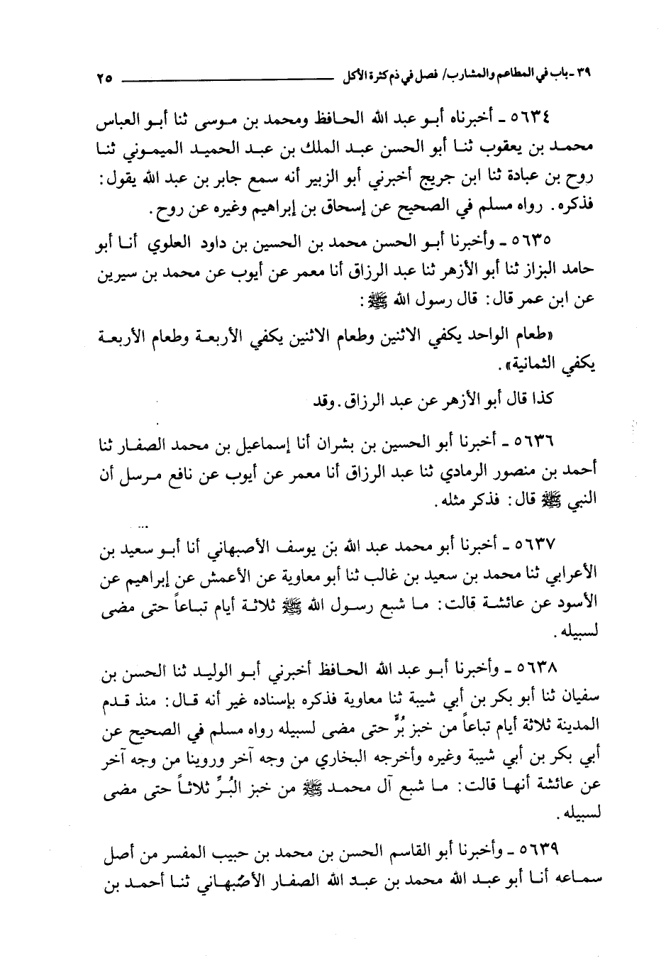 5639 - وأخبرنا أبو القاسم الحسن بن محمد بن حبيب المفسر من أصل سماعه أنا أبو عبد الله محمد بن عبد الله الصفار الأصبهاني ثنا أحمد بن مهران بن رستم أبو جعفر الأصبهاني ثنا سعيد بن الحكم بن أبي مريم المصري ثنا موسى بن يعقوب الزمعي ثنا أبو حازم حدثني القاسم بن محمد أن عائشة أخبرته : أن رسول الله صلى الله عليه و سلم لم يشبع شبعتين في يوم حتى مات