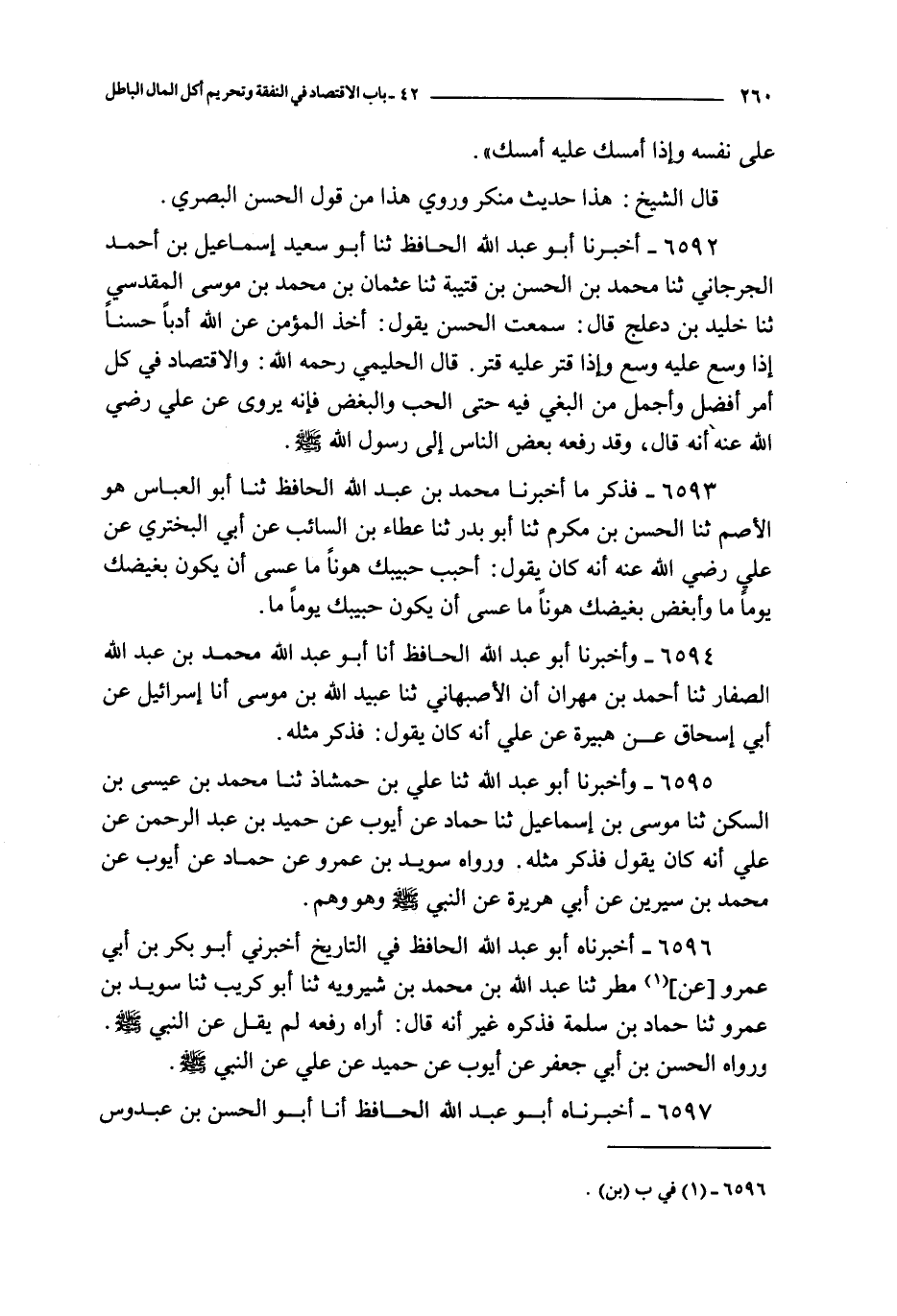 6592 - أخبرنا أبو عبد الله الحافظ ثنا أبو سعيد إسماعيل بن أحمد الجرجاني ثنا محمد بن الحسن بن قتيبة ثنا عثمان بن محمد بن موسى المقدسي ثنا خليد بن دعلج قال : سمعت الحسن يقول : أخذ المؤمن عن الله أدبا حسنا إذا وسع عليه وسع وإذا قتر عليه قتر قال الحليمي رحمه الله : والاقتصاد في كل أمر أفضل وأجمل من البغي فيه حتى الحب والبغض فإنه يروى عن علي رضي الله عنه أنه قال : وقد رفعه بعض الناس إلى رسول الله صلى الله عليه و سلم