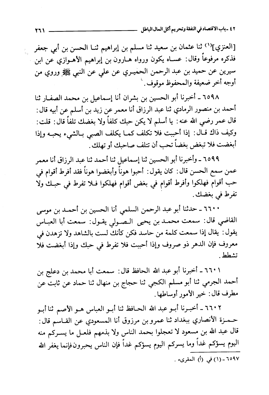 6601 - أخبرنا أبو عبد الله الحافظ قال : سمعت أبا محمد بن دعلج بن أحمد الجرمي ثنا أبو مسلم الكجي ثنا حجاج بن منهال ثنا حماد عن ثابت عن مطرف قال : خير الأمور أوساطها