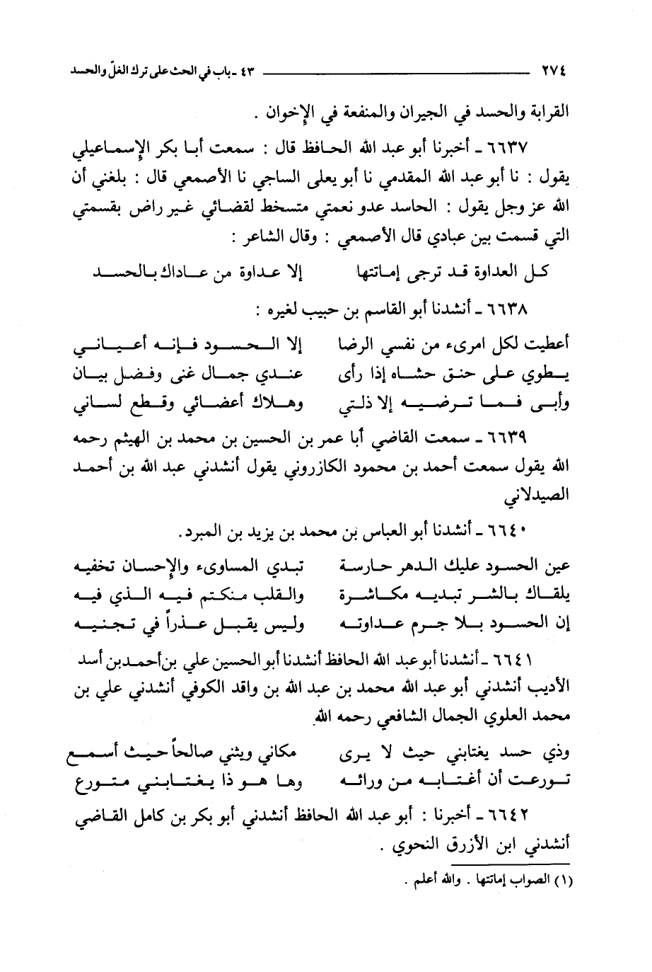 6637 - أخبرنا أبو عبد الله الحافظ قال : سمعت أبا بكر الإسماعيلي يقول : نا أبو عبد الله المقدمي نا أبو يعلى الساجي نا الأصمعي قال : بلغني أن الله عز و جل يقول : الحاسد عدو نعمتي متسخط لقضائي غير راض بقسمتي التي قسمت بين عبادي قال الأصمعي : وقال الشاعر :