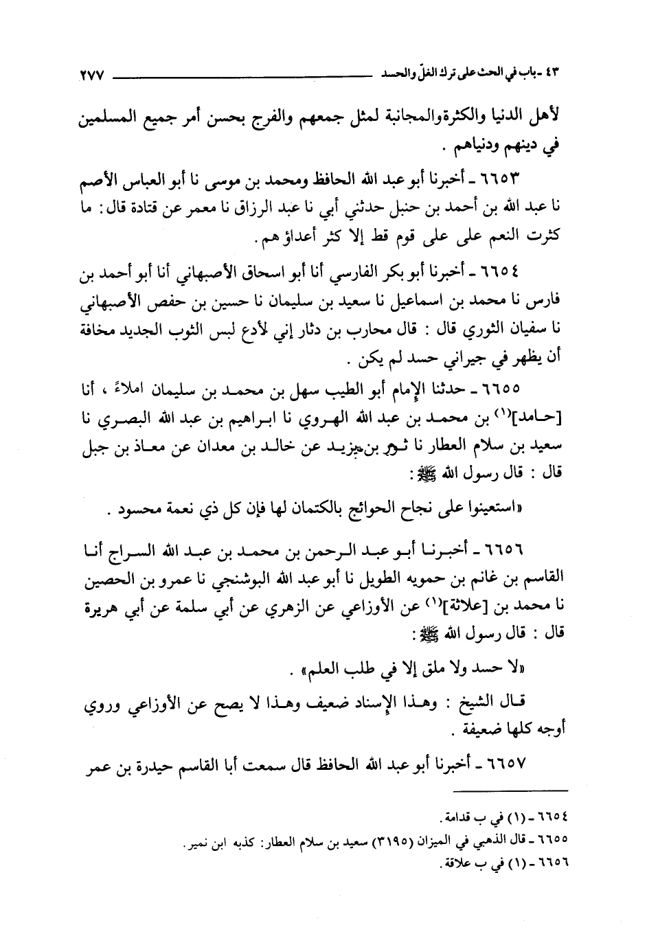 6654 - أخبرنا أبو بكر الفارسي أنا أبو إسحاق الأصبهاني أنا أبو أحمد بن فارس نا محمد بن إسماعيل نا سعيد بن سليمان نا حسين بن حفص الأصبهاني نا سفيان الثوري قال : قال محارب بن دثار : إني لأدع لبس الثوب الجديد مخافة أن يظهر في جيراني حسد لم يكن