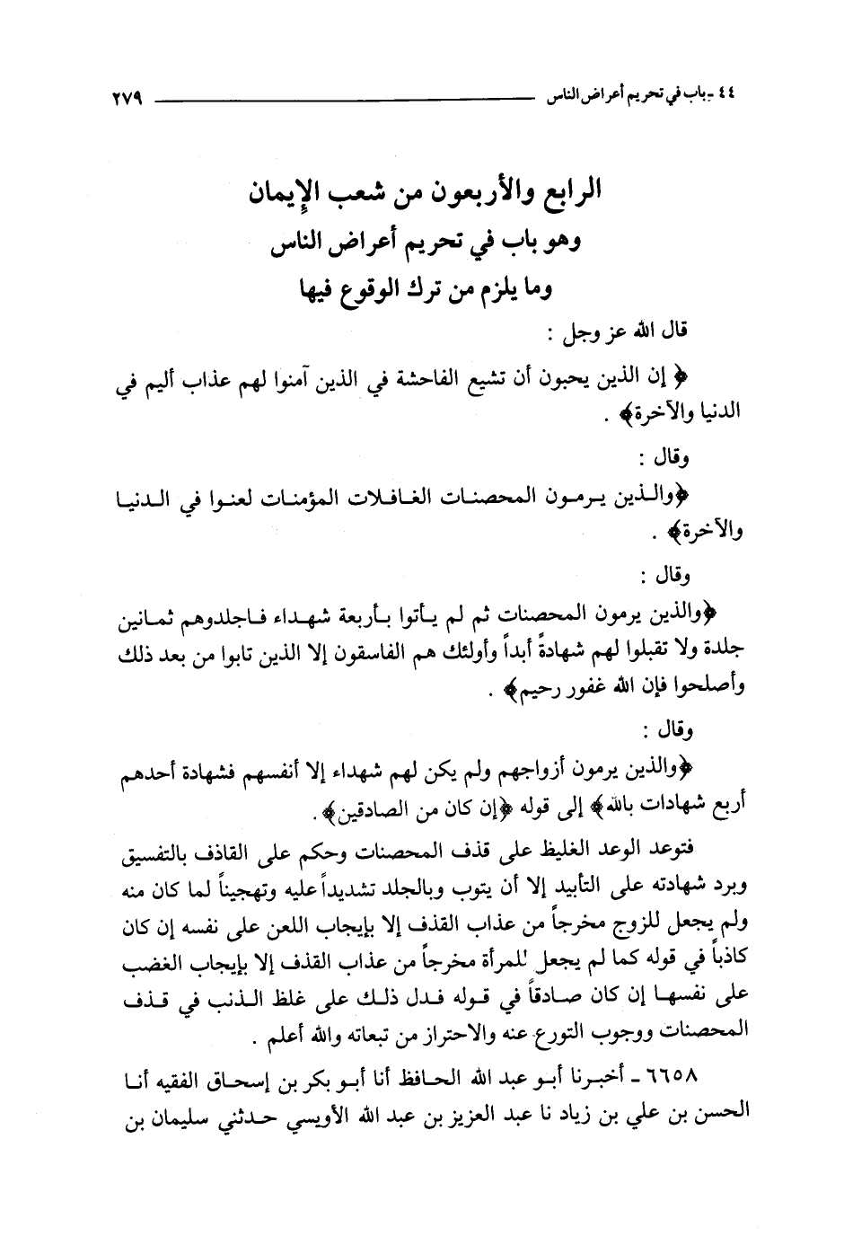 الرابع والأربعون من شعب الإيمان وهو باب في تحريم أعراض الناس وما يلزم من ترك الوقوع فيها ـ قال الله عز و جل : { إن الذين يحبون أن تشيع الفاحشة في الذين آمنوا لهم عذاب أليم في الدنيا والآخرة } وقال : { إن الذين يرمون المحصنات الغافلات المؤمنات لعنوا في الدنيا والآخرة } وقال : { والذين يرمون المحصنات ثم لم يأتوا بأربعة شهداء فاجلدوهم ثمانين جلدة ولا تقبلوا لهم شهادة أبدا وأولئك هم الفاسقون * إلا الذين تابوا من بعد ذلك وأصلحوا فإن الله غفور رحيم } وقال : { والذين يرمون أزواجهم ولم يكن لهم شهداء إلا أنفسهم فشهادة أحدهم أربع شهادات بالله } إلى قوله { إن كان من الصادقين } فتوعد الوعد الغليظ على قذف المحصنات وحكم على القاذف بالتفسيق وبرد شهادته على التأبيد إلا أن يتوب وبالجلد تشديدا عليه وتهجينا لما كان منه ولم يجعل للزوج مخرجا من عذاب القذف إلا بإيجاب اللعن على نفسه إن كان كاذبا في قوله كما لم يجعل للمرأة مخرجا من عذاب القذف إلا بإيجاب الغضب على نفسها إن كان صادقا في قوله فدل ذلك على غلظ الذنب في قذف المحصنات ووجوب التورع عنه والاحتراز من تبعاته والله أعلم