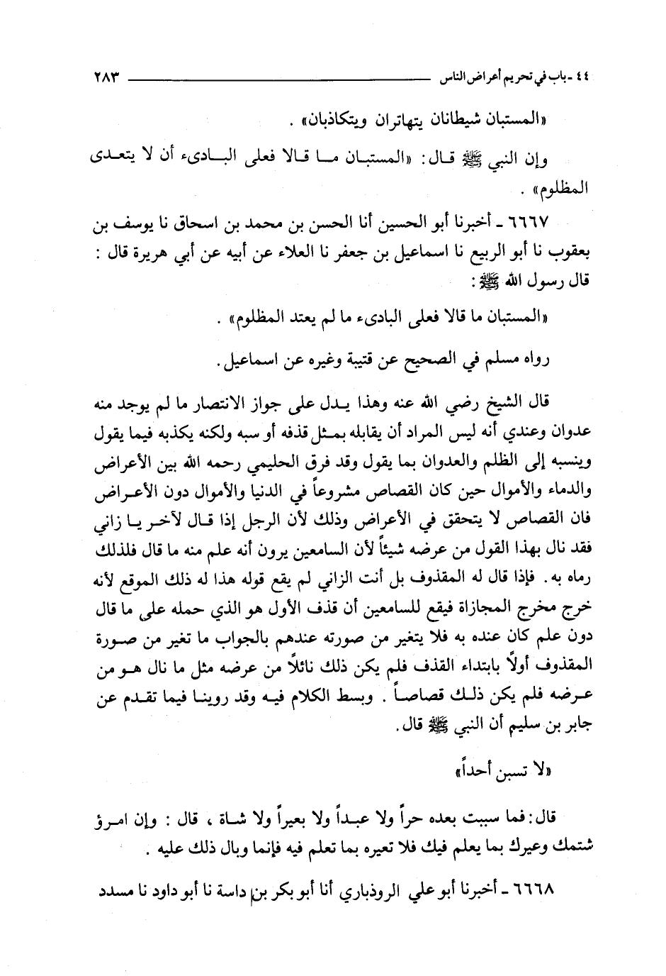 قال الشيخ رضي الله عنه وهذا يدل على جواز الانتصار ما لم يوجد منه عدوان وعندي أنه ليس المراد أن يقابله بمثل قذفه أو سبه ولكنه يكذبه فيما يقول وينسبه إلى الظلم والعدوان بما يقول وقد فرق الحليمي رحمه الله بين الأعراض و الدماء و الأموال حين كان القصاص مشروعا في الدنيا والأموال دون الأعراض فإن القصاص لا يتحقق في الأعراض وذلك لأن الرجل إذا قال لآخر يا زاني فقد نال بهذا القول من عرضه شيئا لأن السامعين يرون أنه علم منه ما قال فلذلك رماه به فإذا قال له المقذوف بل أنت الزاني لم يقع قوله هذا له ذلك الموقع لأنه خرج مخرج المجازاة فيقع للسامعين أن قذف الأول هو الذي حمله على ما قال دون علم كان عنده به فلا يتغير من صورته عندهم بالجواب ما تغير من صورة المقذوف أولا بابتداء القذف فلم يكن نائلا من عرضه مثل ما نال من عرضه فلم يكن قصاصا وبسط الكلام فيه وقد روينا فيما تقدم عن جابر بن سليم أن النبي صلى الله عليه و سلم قال
